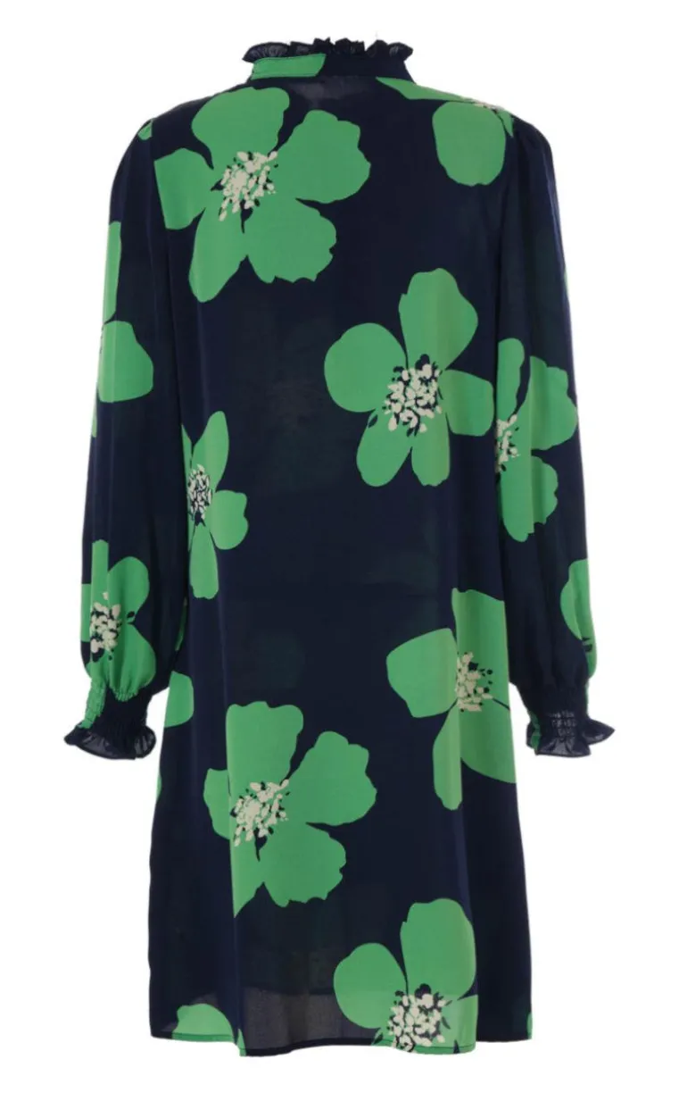 Kjolen har lange ærmer med smock forneden, høj hals med flæsedetalje og knapper.