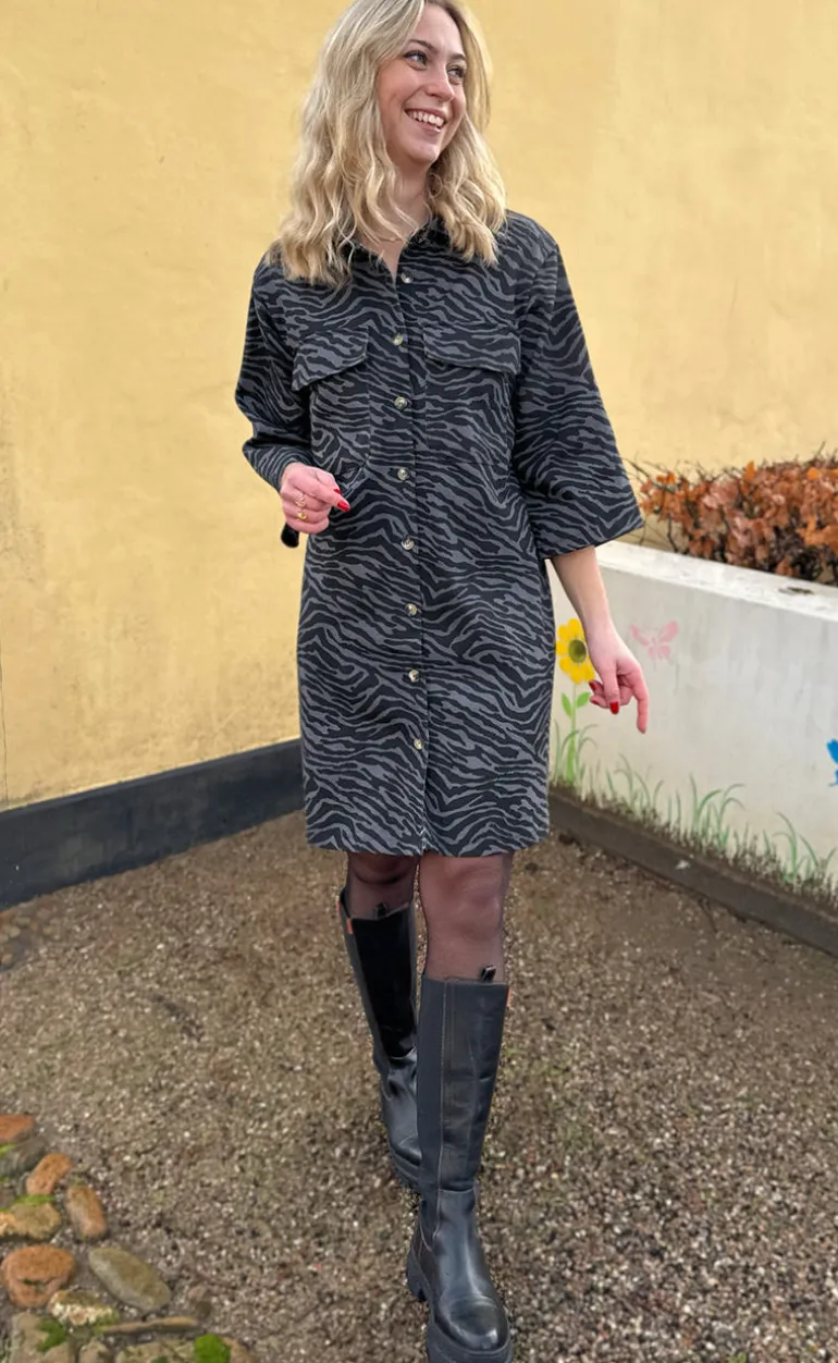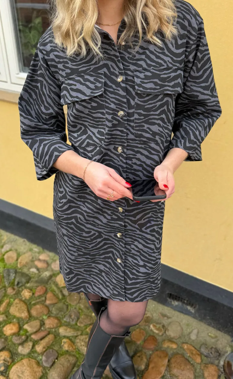 Smart kjole fra INA Copenhagen i denim med zebra print i grå nuancer.