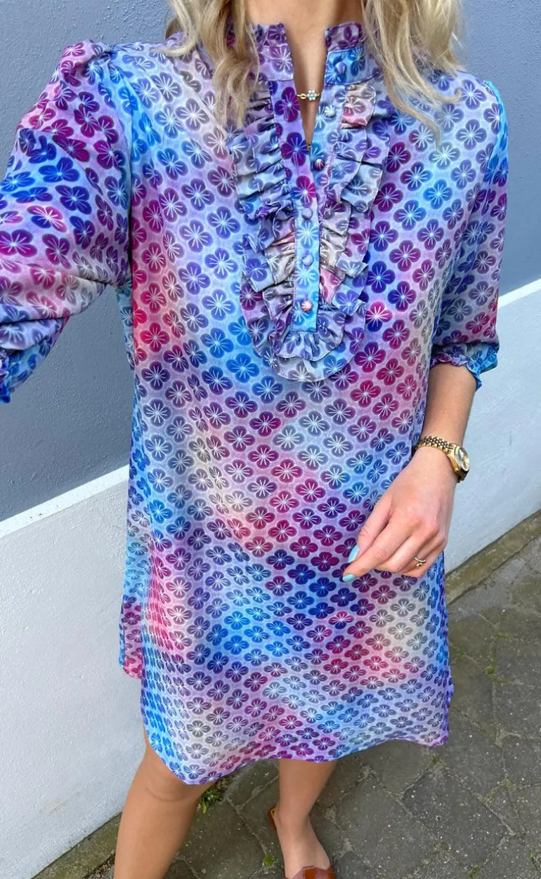 Smuk kjole fra INA Copenhagen med det fineste mønster og flæser fortil.