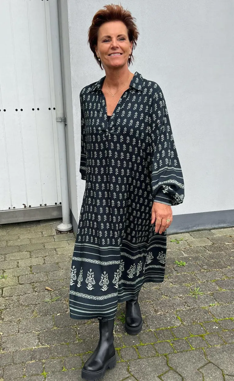 Flot kjole kjole fra INA Copenhagen i sort med det flotteste print.