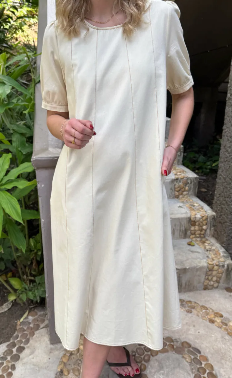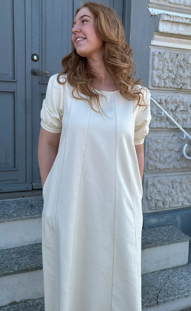 Elegant kjole fra INA Copenhagen i creme hvid, med kontrat syninger i farven brun.