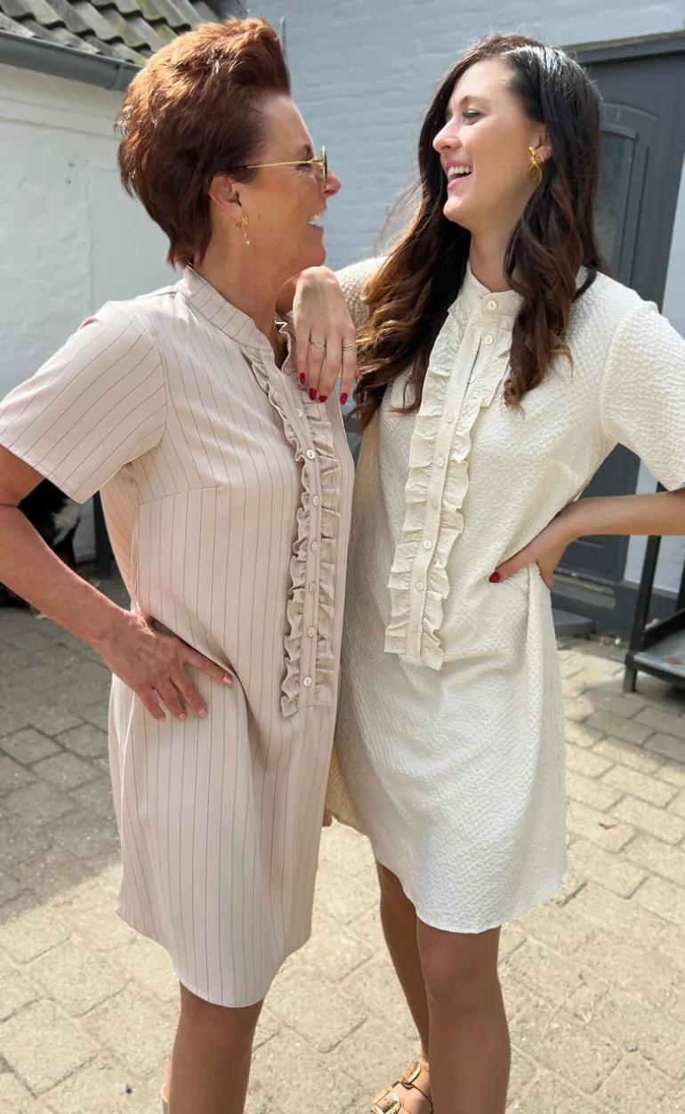 Den fineste kjole fra INA Copenhagen i beige med sorte nålestriber.