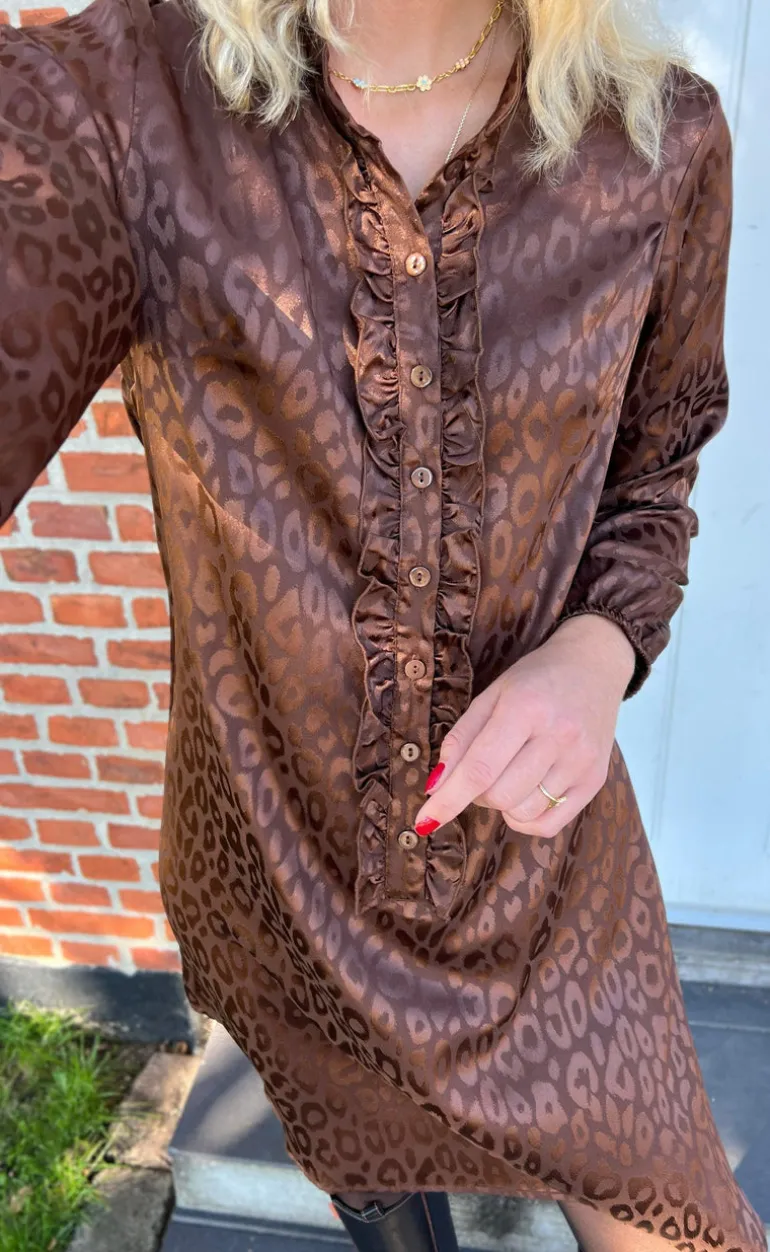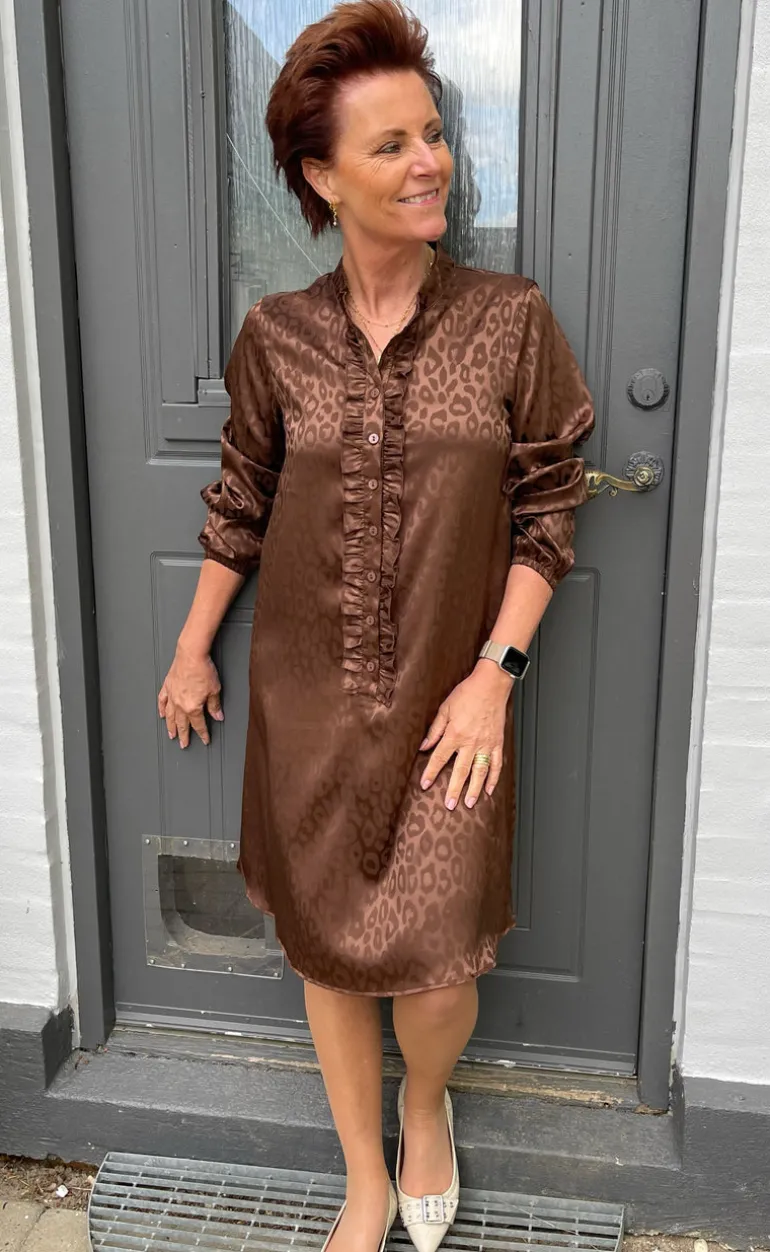 Smart kjole fra INA Copenhagen i brun med et skinnende udtryk.
