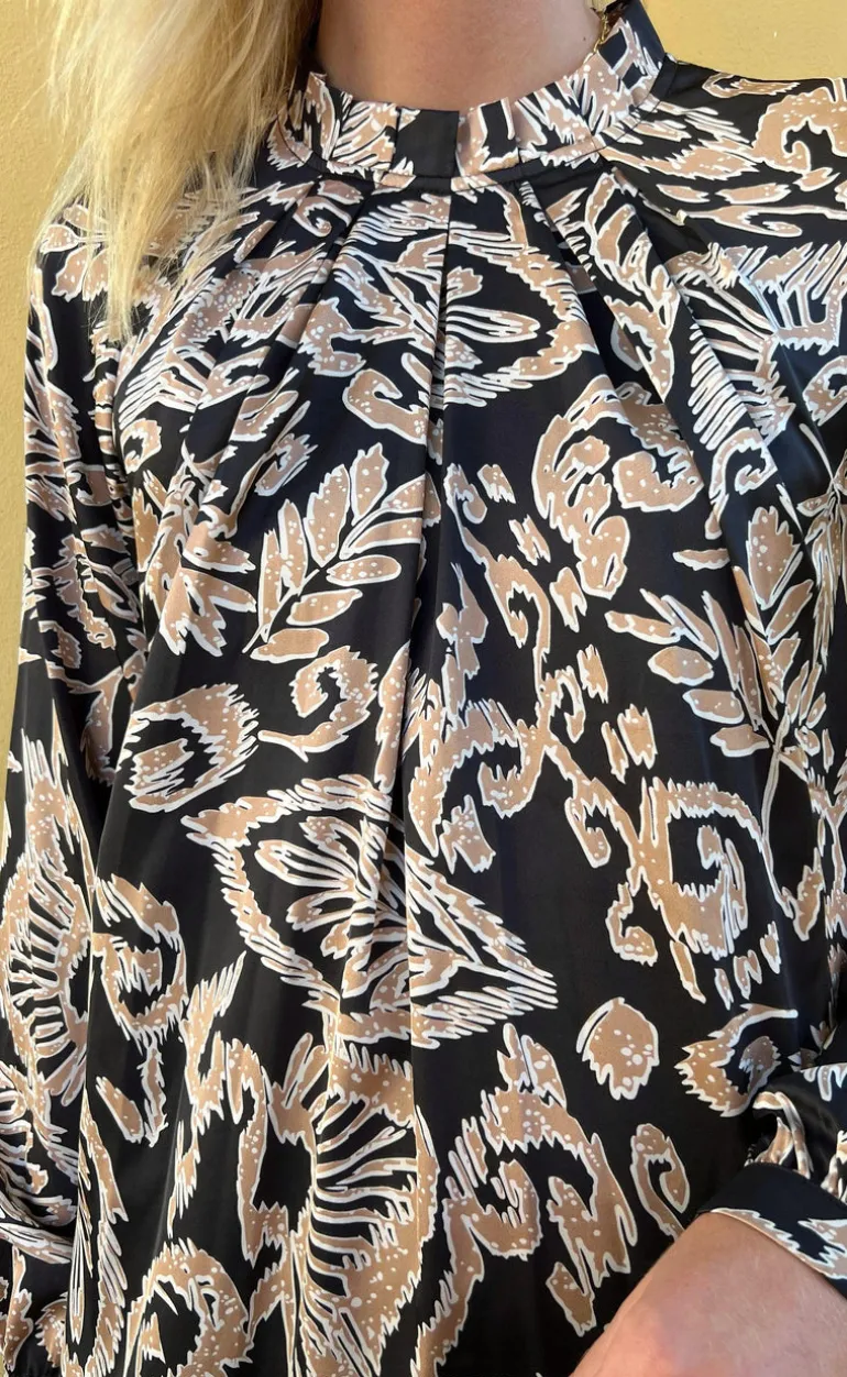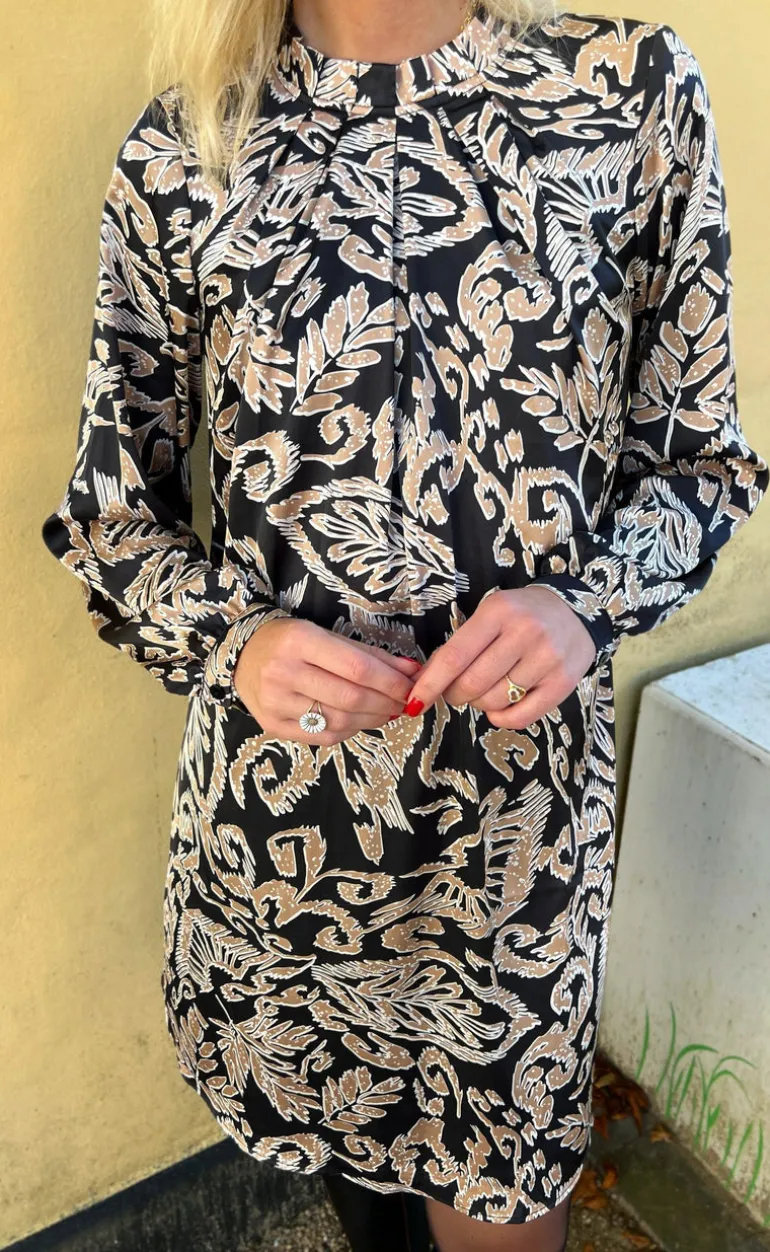 Skøn kjole fra INA Copenhagen i sort print af blade i brune nuancer.