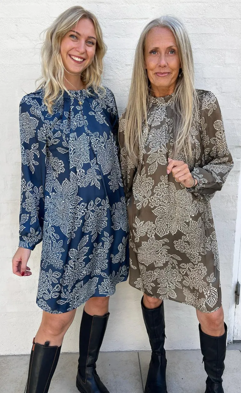 Smuk kjole fra INA Copenhagen i navy blå med de smukkeste detaljer ved halsen og fortil ved brystet.