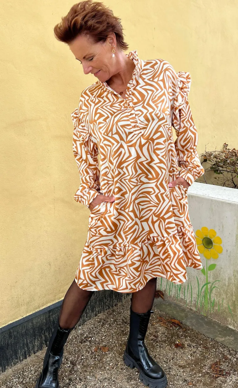 Smuk og elegant kjole fra INA Copenhagen med print i camel og beige.