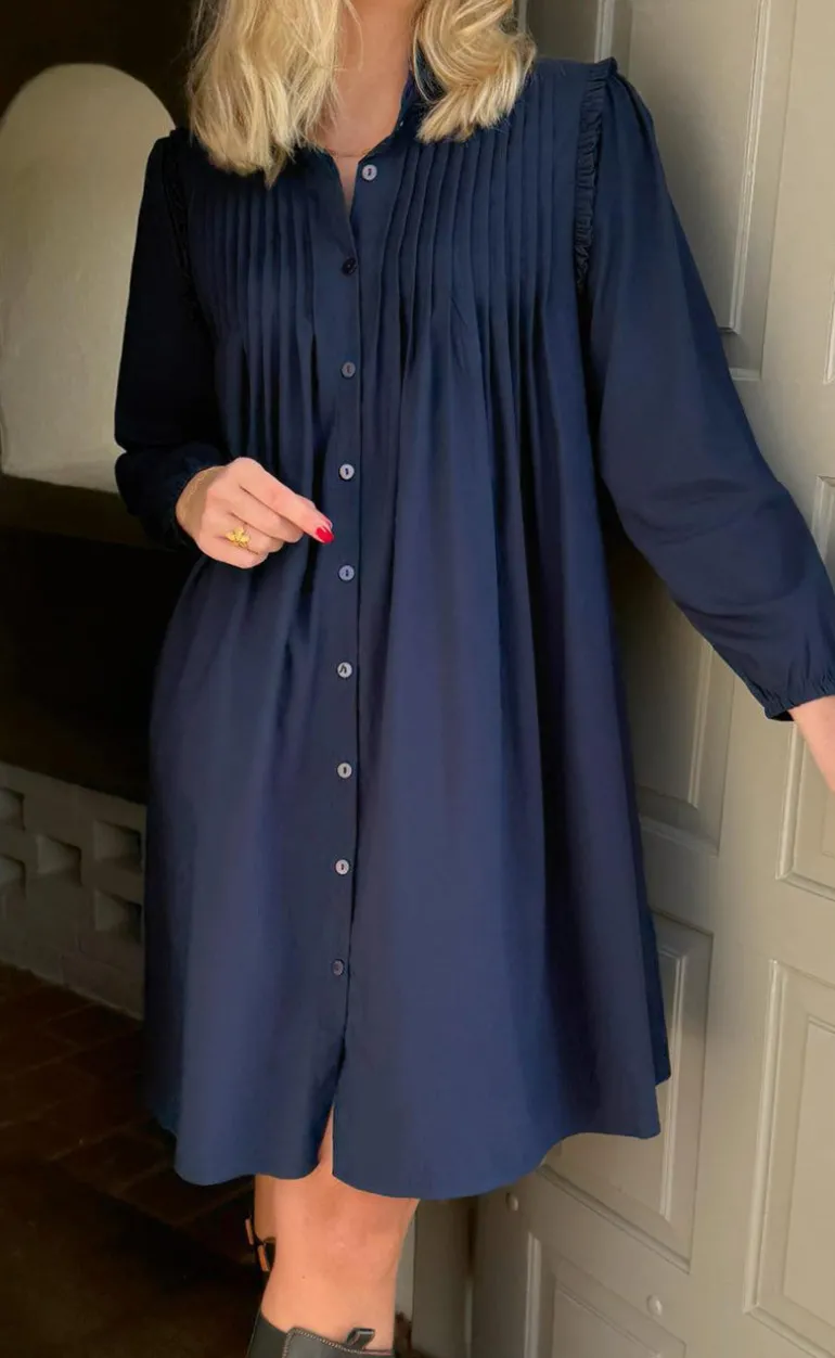 Kjolen har lange ærmer og en åbning fortil med knapper. Kjolen har de fineste flæse-detaljer fortil ved brystet, som sikrer en virkelig flot pasform.