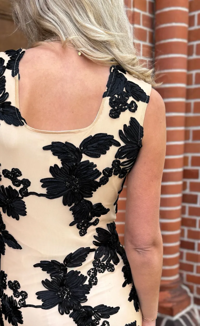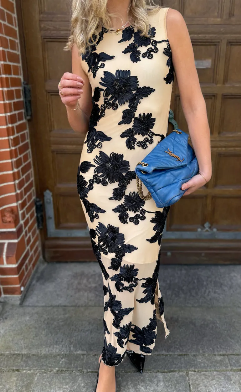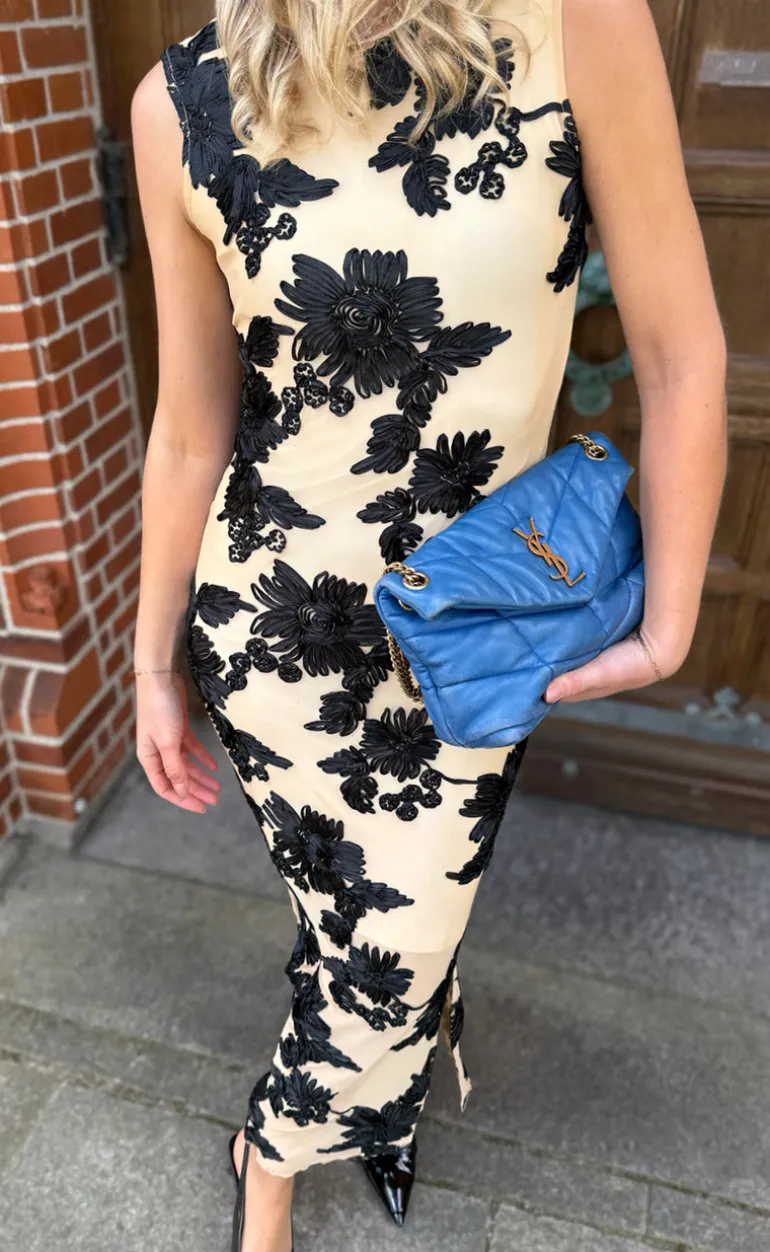 Eksklusiv kjole fra Say INA Copenhagen i beige mesh med flotte 3D blomster i sort.