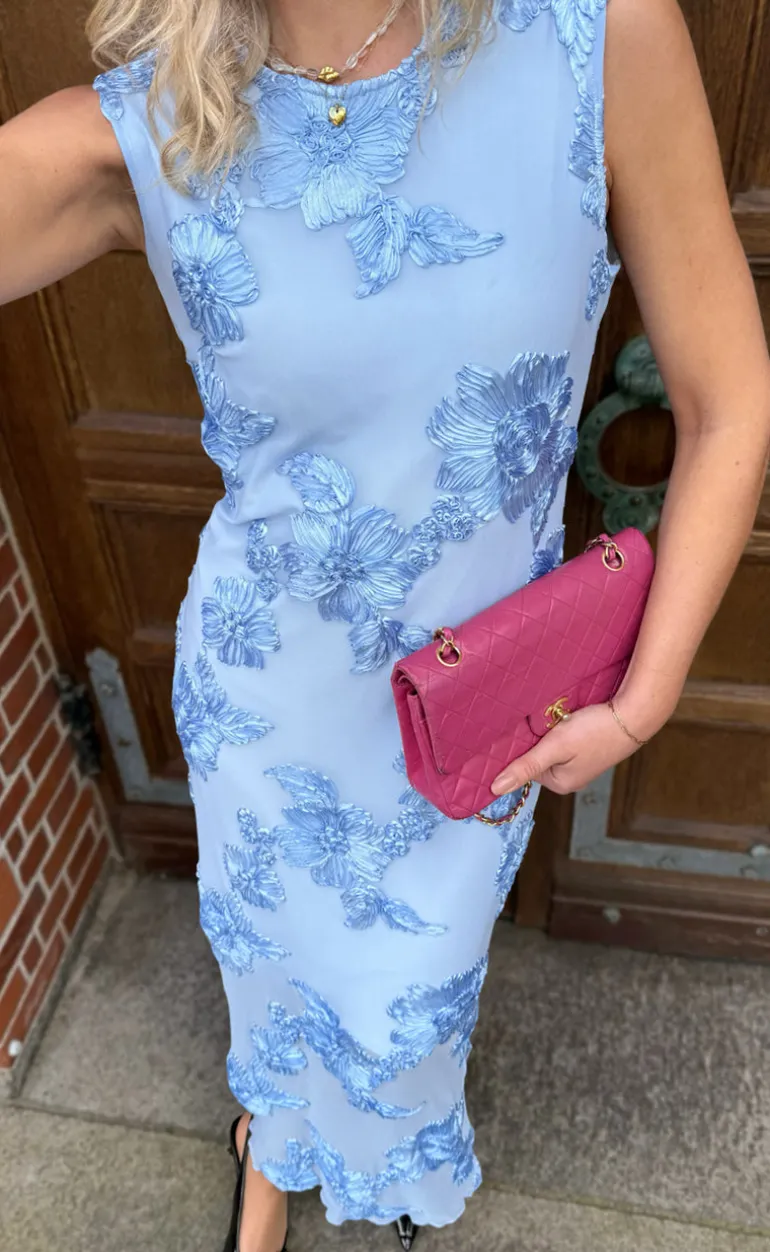 Elegant og eksklusiv kjole fra Say INA Copenhagen i blå mesh med flotte 3D blomster.