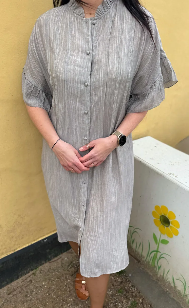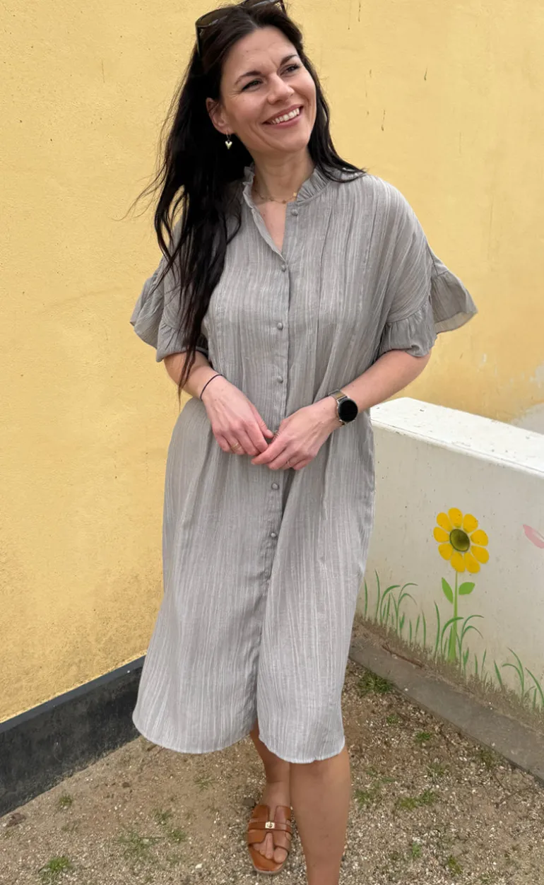 Kjolen er gennemknappet, har de fineste syningsdetaljer fortil samt en flæsekant både forneden og ved ærmerne.