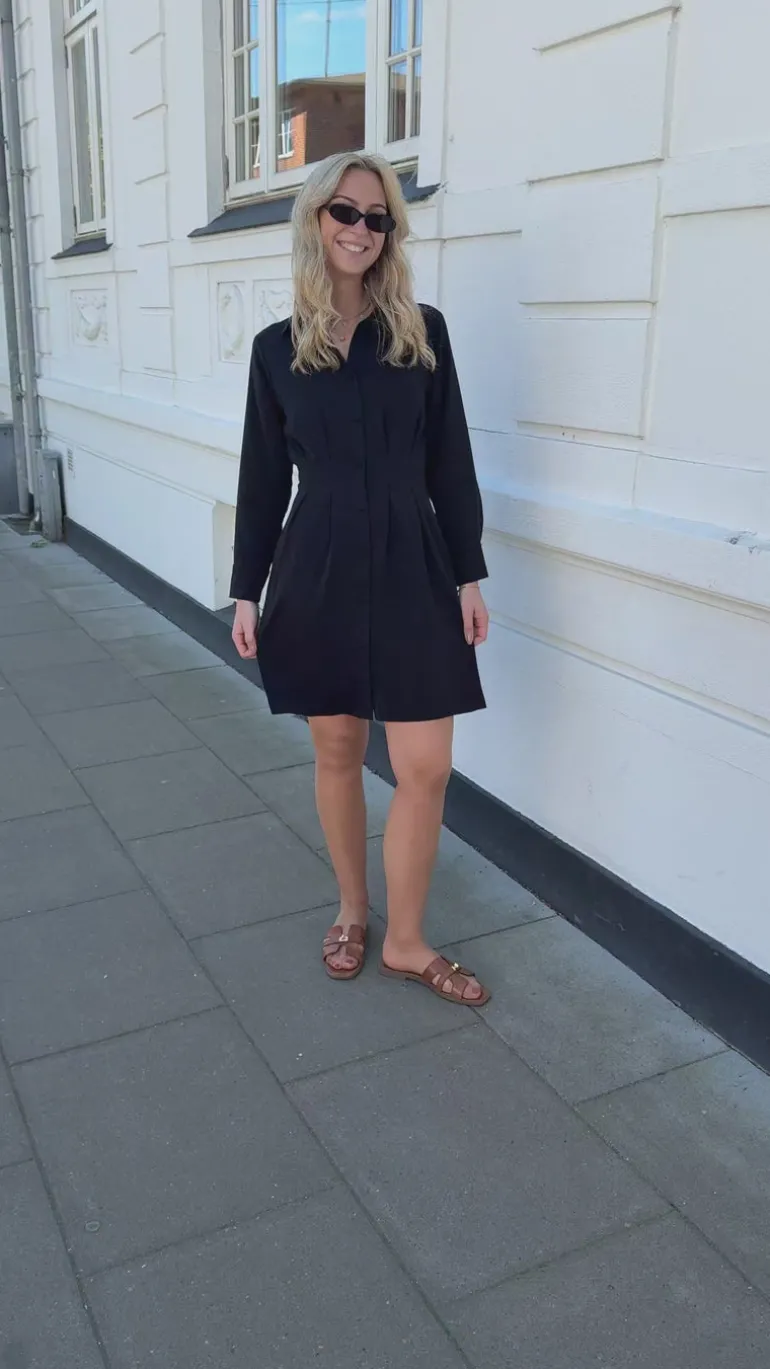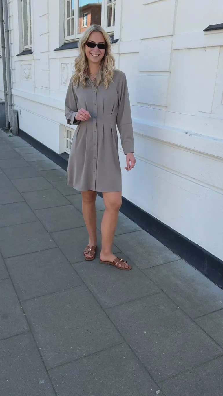 Kjolen har lange ærmer, åbnes med knapper fortil og har de fineste syningsdetaljer i siderne, så kjolen får et feminint udtryk.