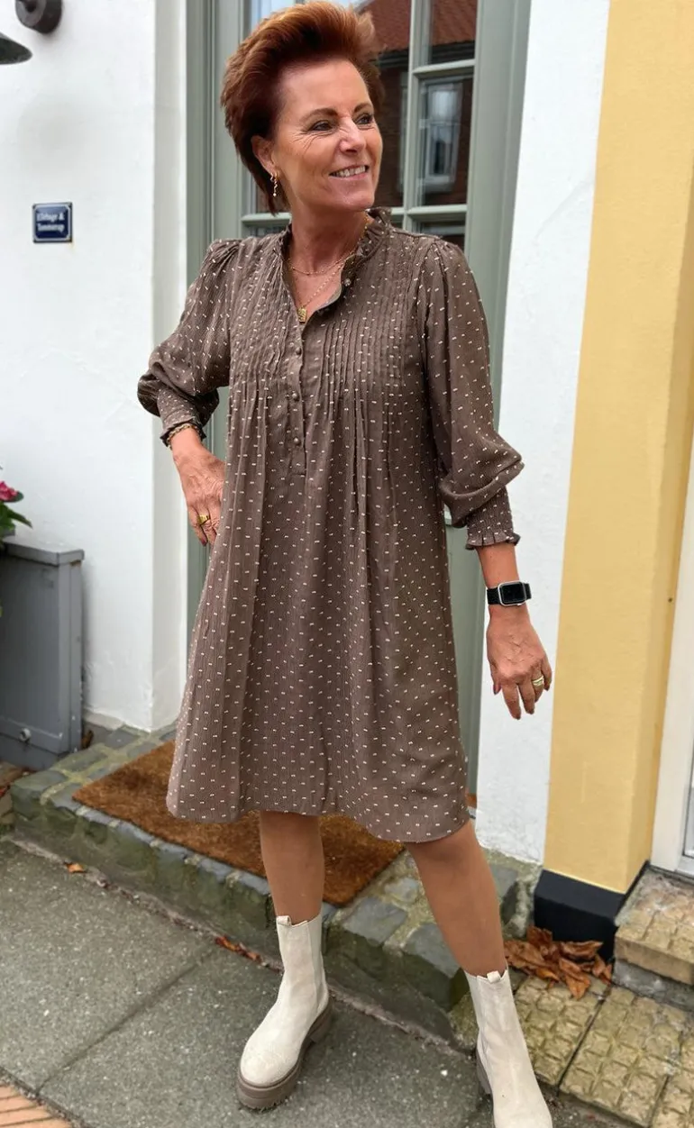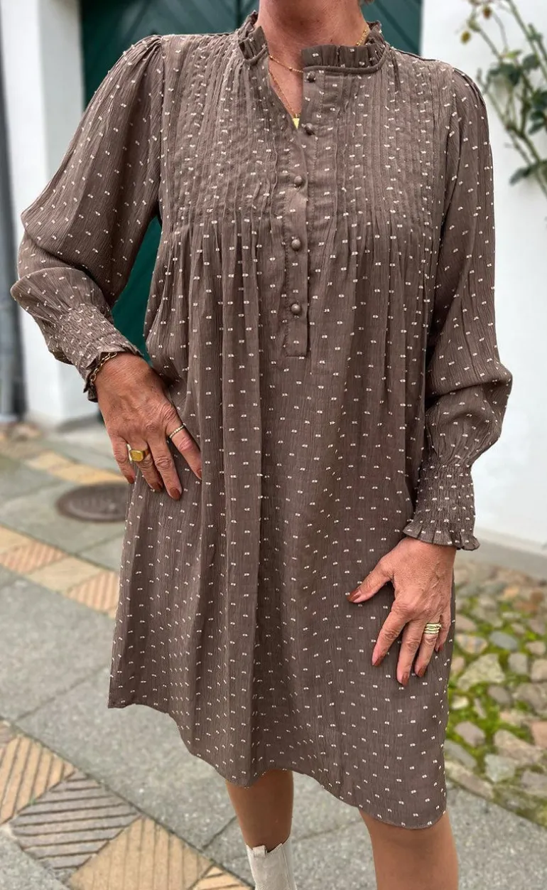 Kjolen har lange ærmer og en åbning med knapper i den øverste del.