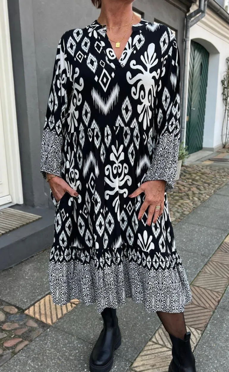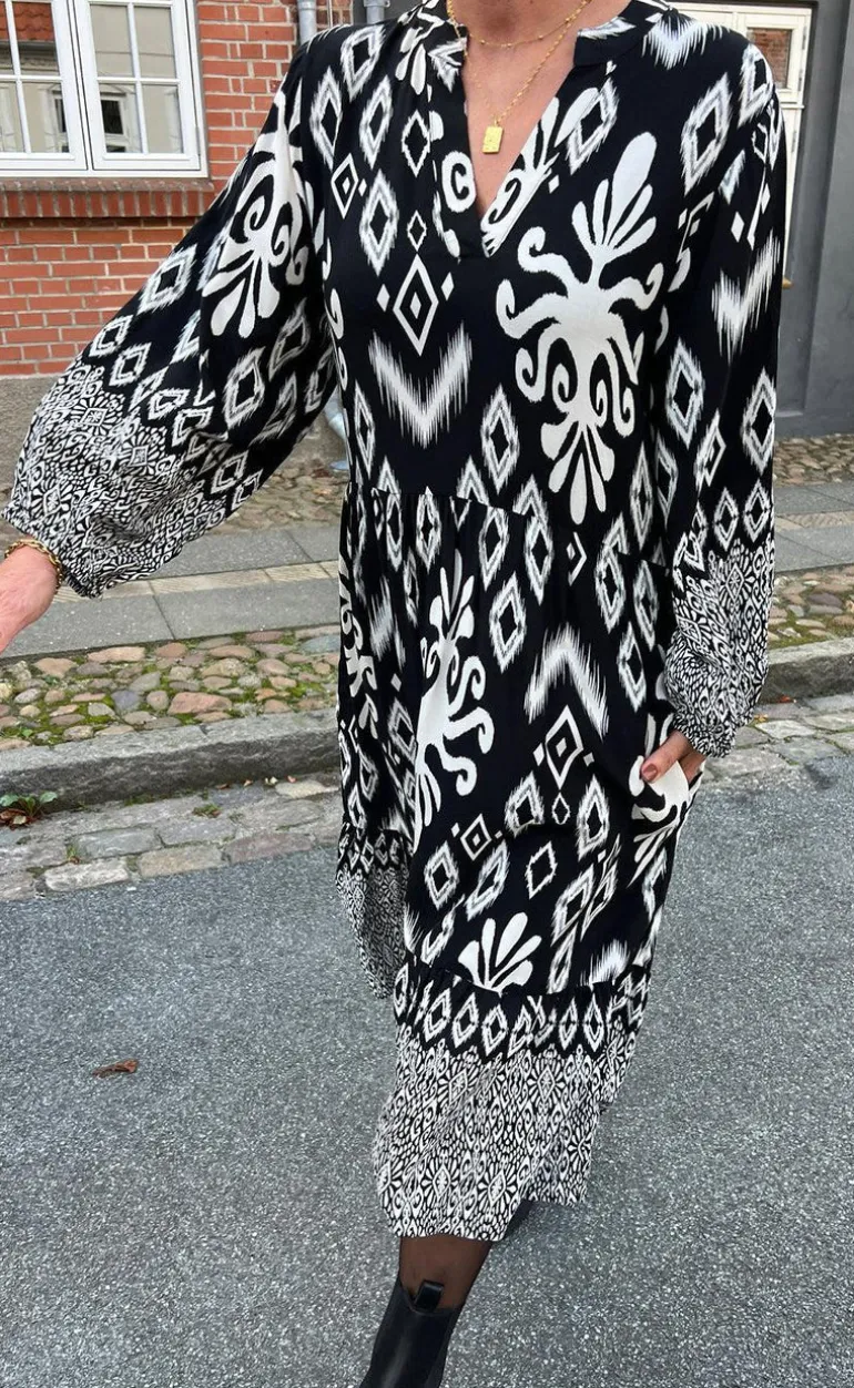 Smuk kjole fra INA Copenhagen i sort med hvidt paisley mønster.