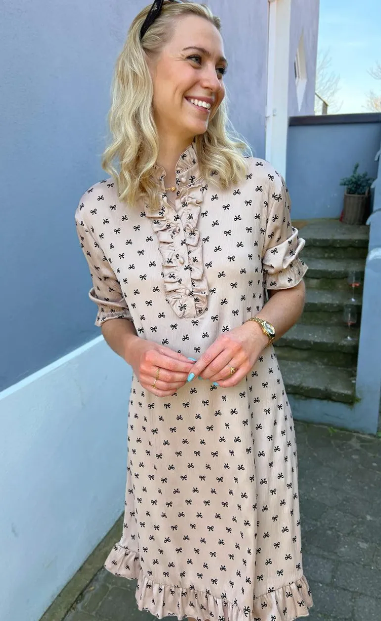Fin kjole fra INA Copenhagen i en camel nuance med sorte sløjfer.