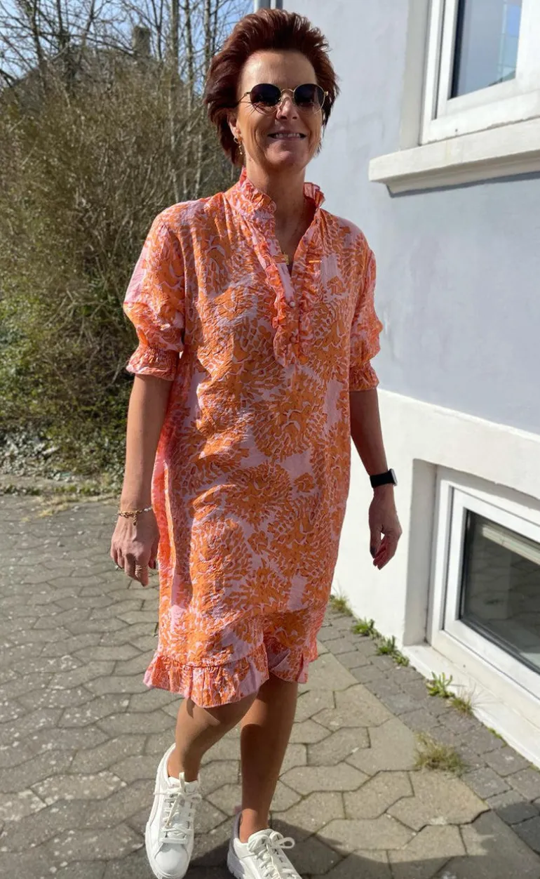 Flot kjole kjole fra INA Copenhagen med print i lyserøde- og orange farver.