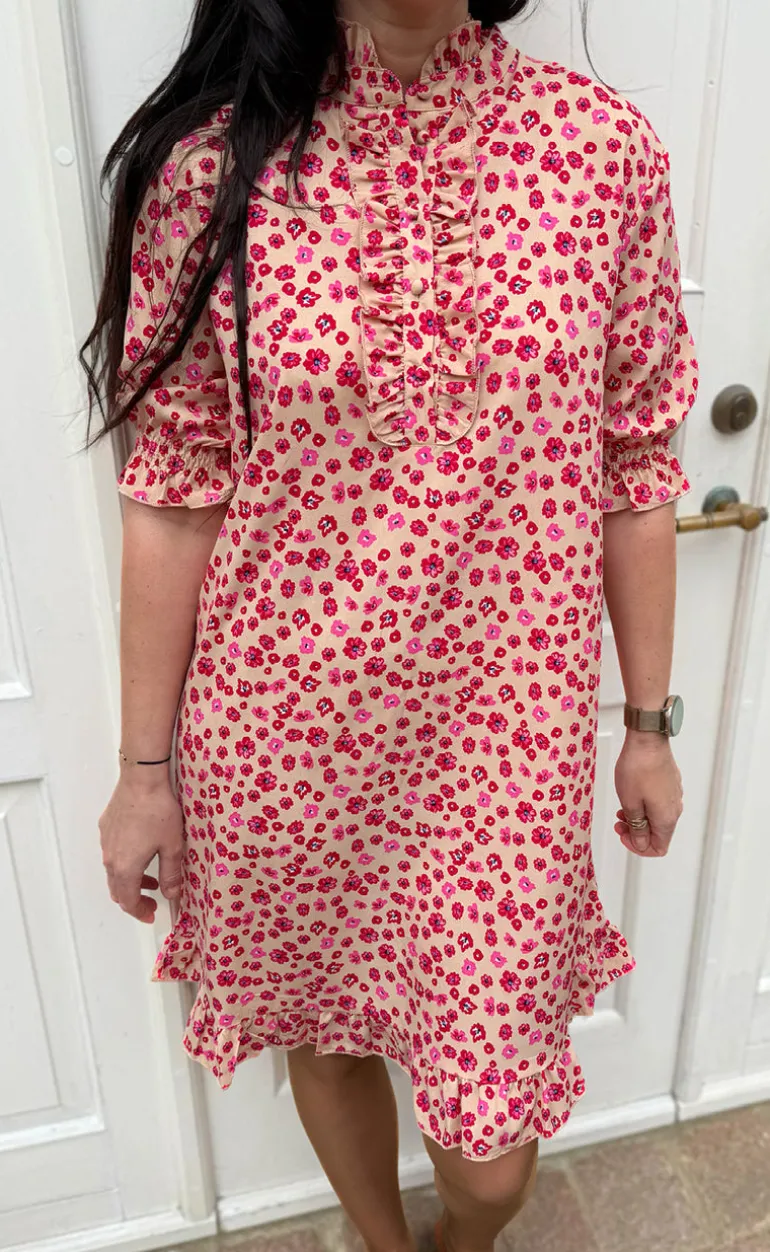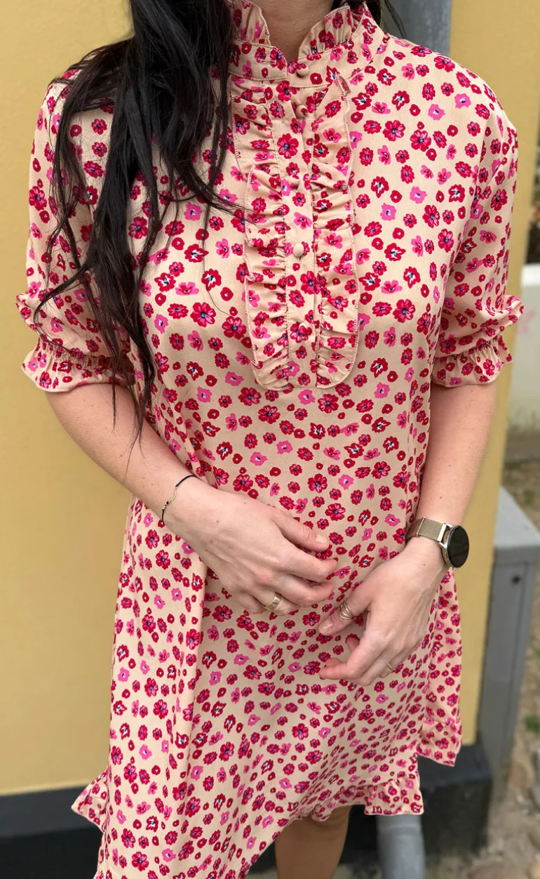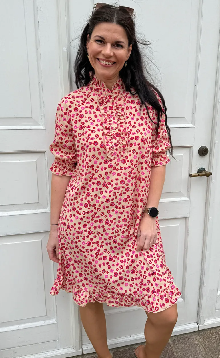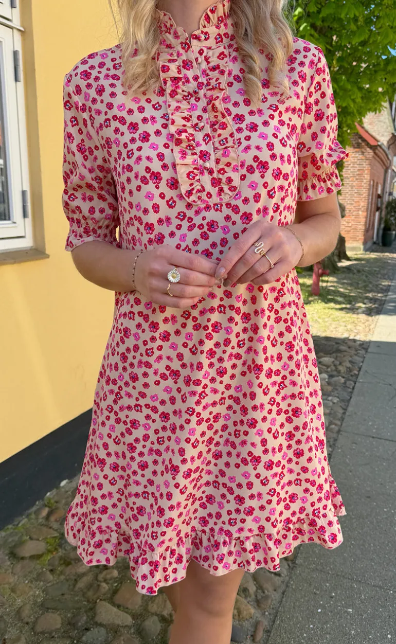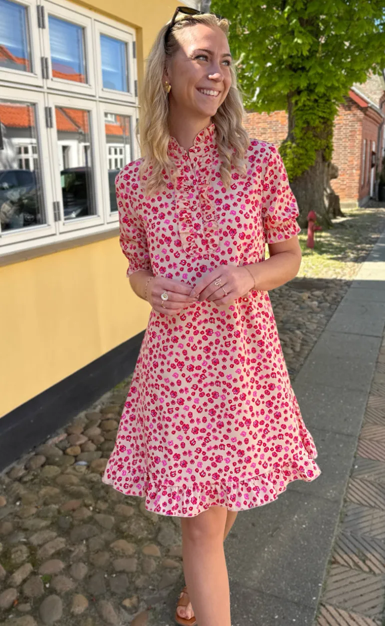 Flot kjole kjole fra INA Copenhagen med blomster i pinke og røde nuancer.