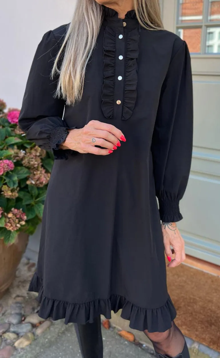 Smuk kjole fra INA Copenhagen i sort med guld knapper.