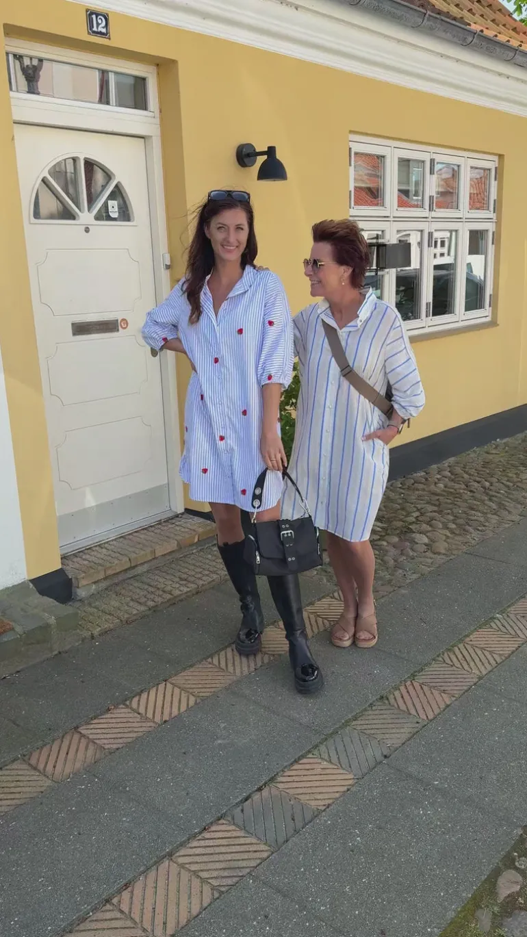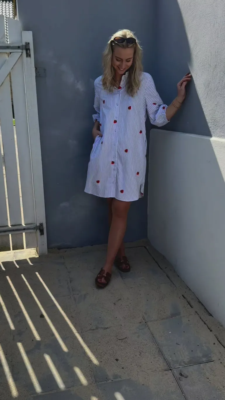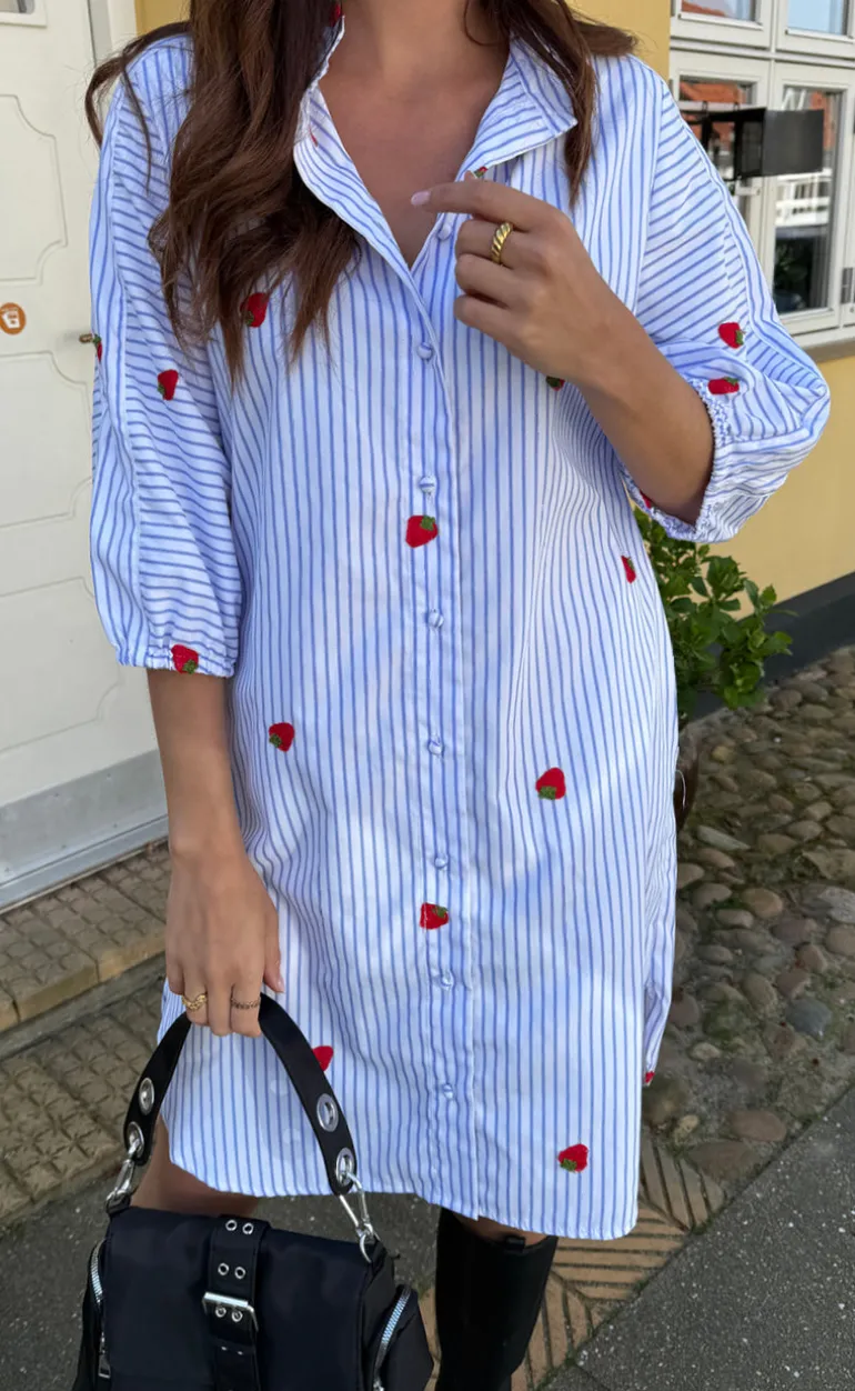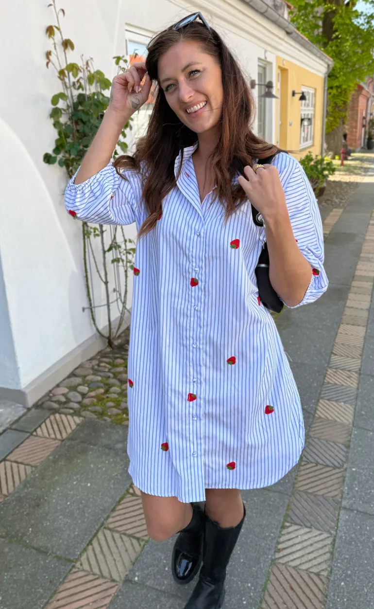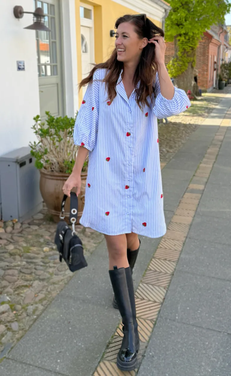 Den yndigste kjole fra INA Copenhagen i et blå og hvid stribet print, med små broderede jordbår.
