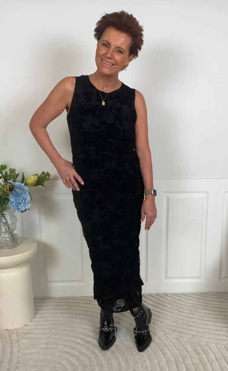 Den smukkeste mesh kjole fra INA Copenhagen i sort med sorte blomster i velour.
