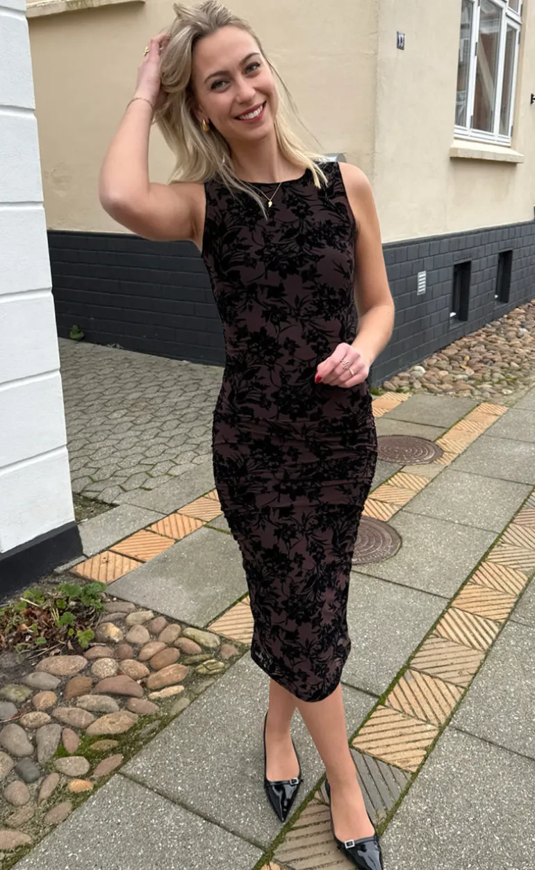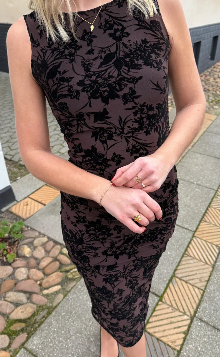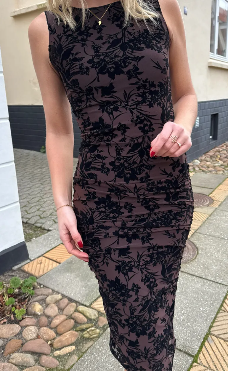 Den smukkeste mesh kjole fra INA Copenhagen i en brun farve med sorte blomster i velour.