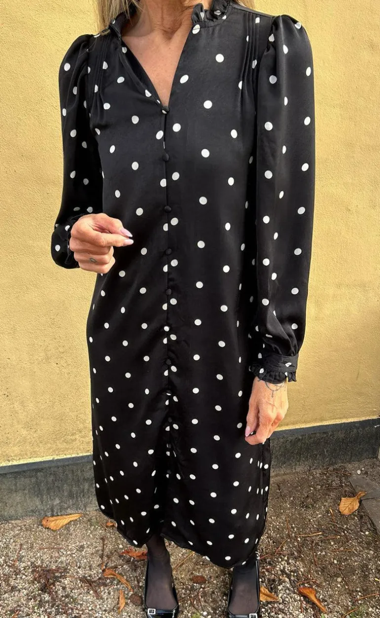 Smart skjortekjole fra INA Copenhagen i sort med hvide prikker.