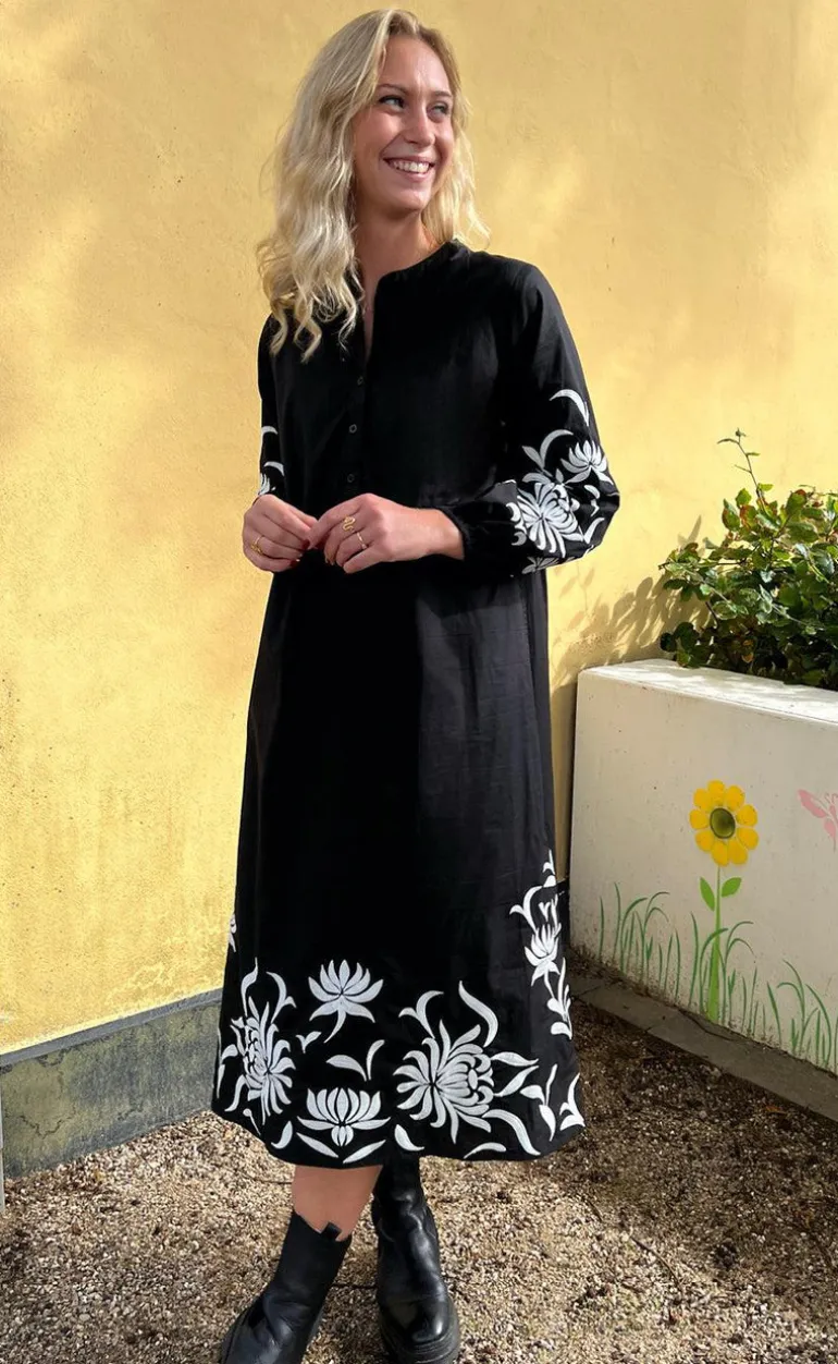 Fin kjole fra INA Copenhagen i sort med et flot broderet mønster på ærmerne og i bunden af kjolen i hvid.