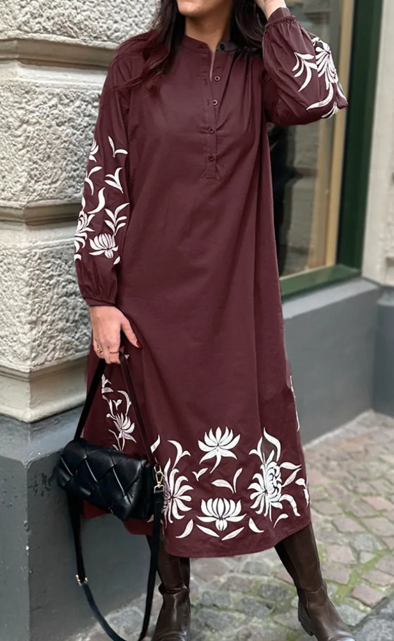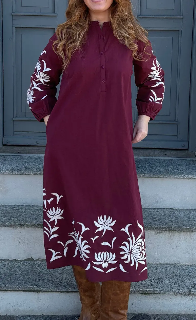 Fin kjole fra INA Copenhagen i burgundy rød med et flot broderet mønster på ærmerne og i bunden af kjolen i hvid.
