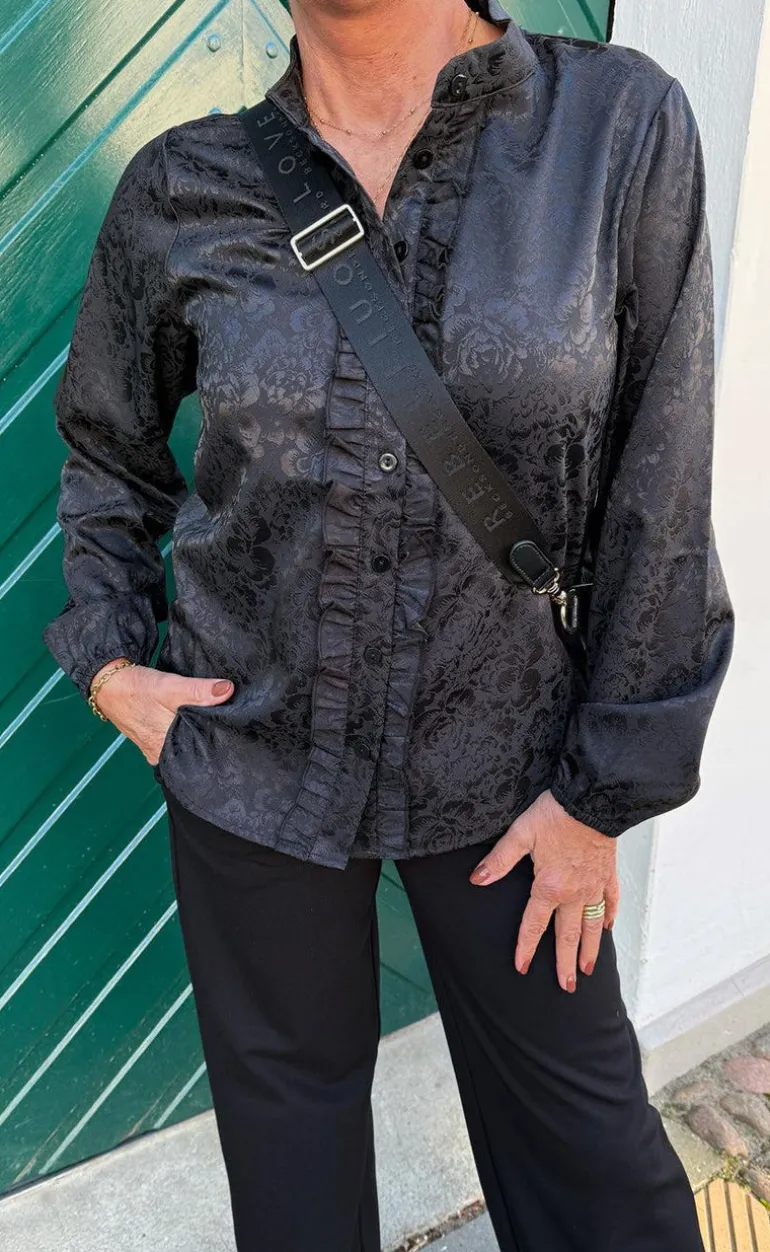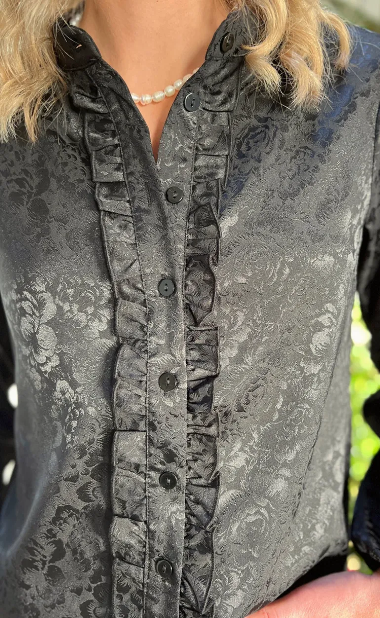Eksklusiv skjorte fra INA Copenhagen i sort med et eksklusivt blomstermønster. Skjorten har en åbning fortil med knapper og med de fineste flæser.