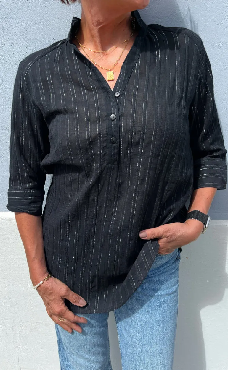 Flot skjorte fra INA Copenhagen i sort med verticale striber i samme farve.
