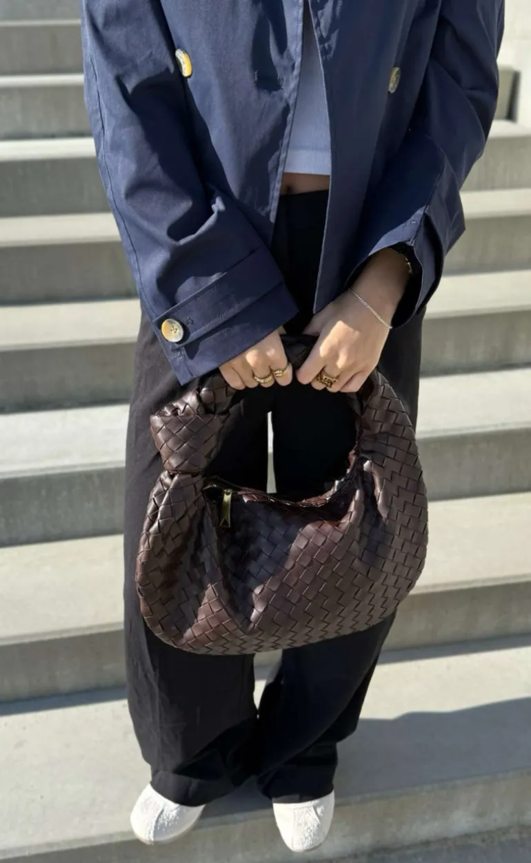 Tasken kan bæres over skulderen og åbnes med en guldfarvet lynlås.