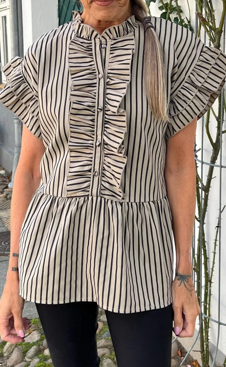 Toppen har et oversize fit, flæse-ærmer og en åbning fortil med flæser omkring.