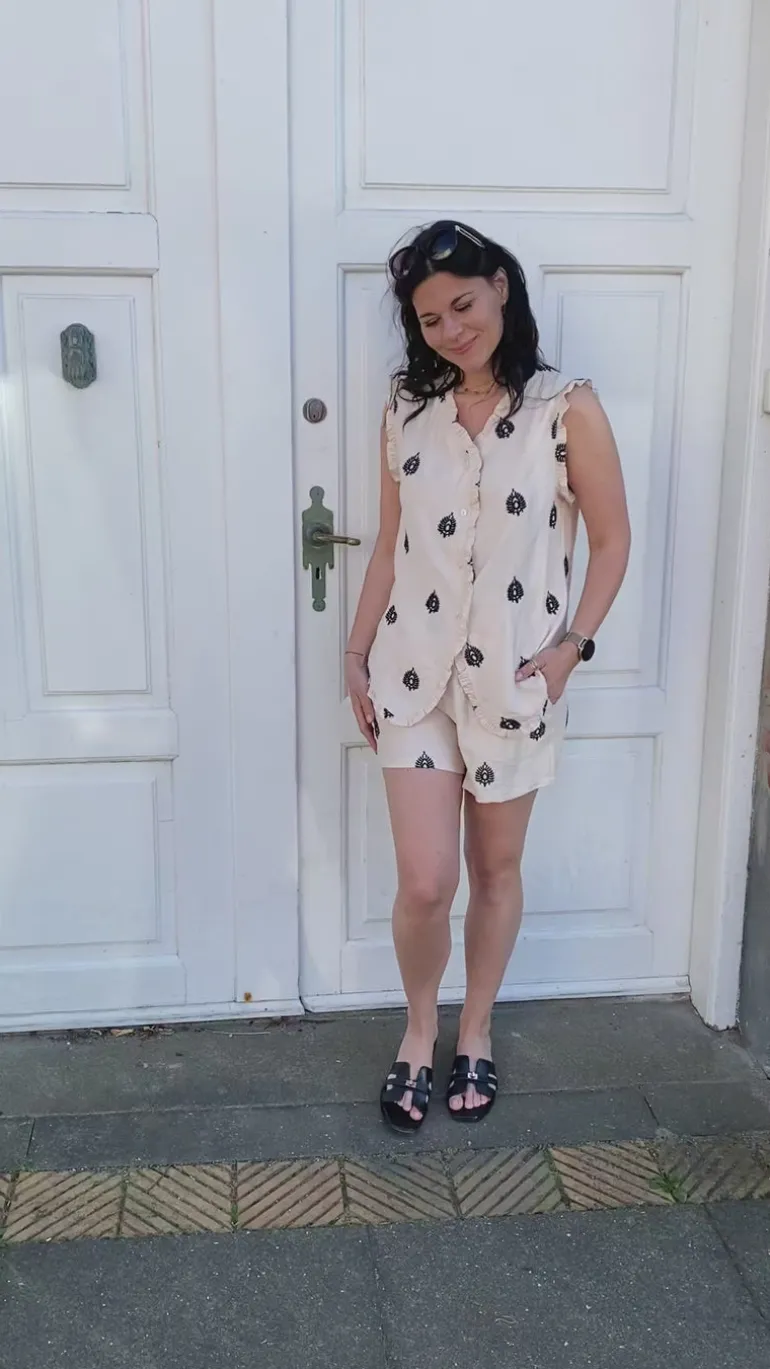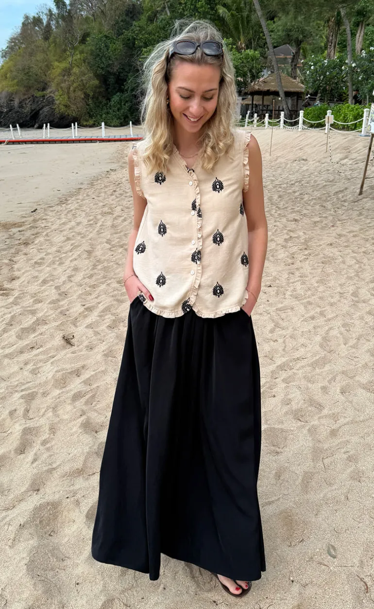 Den smukkeste top fra INA Copenhagen, i beige med sorte broderi detaljer.