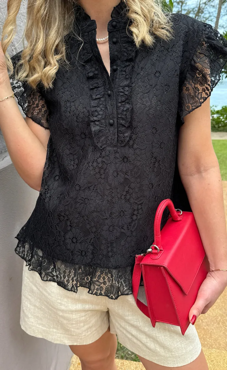 Toppen har flæse-ærmer og en åbning fortil med flæser omkring. Toppen har fastsyet for, så den ikke er gennemsigtig.