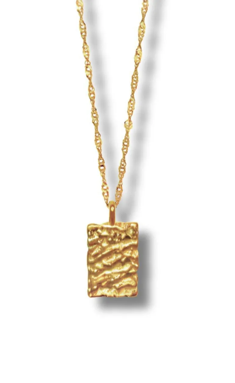 Flot halskæde fra Smykkeli Copenhagen i guld med et firkantet vedhæng, der har en hamret overflade. Den perfekte halskæde til både hverdag og særlige lejligheder!
