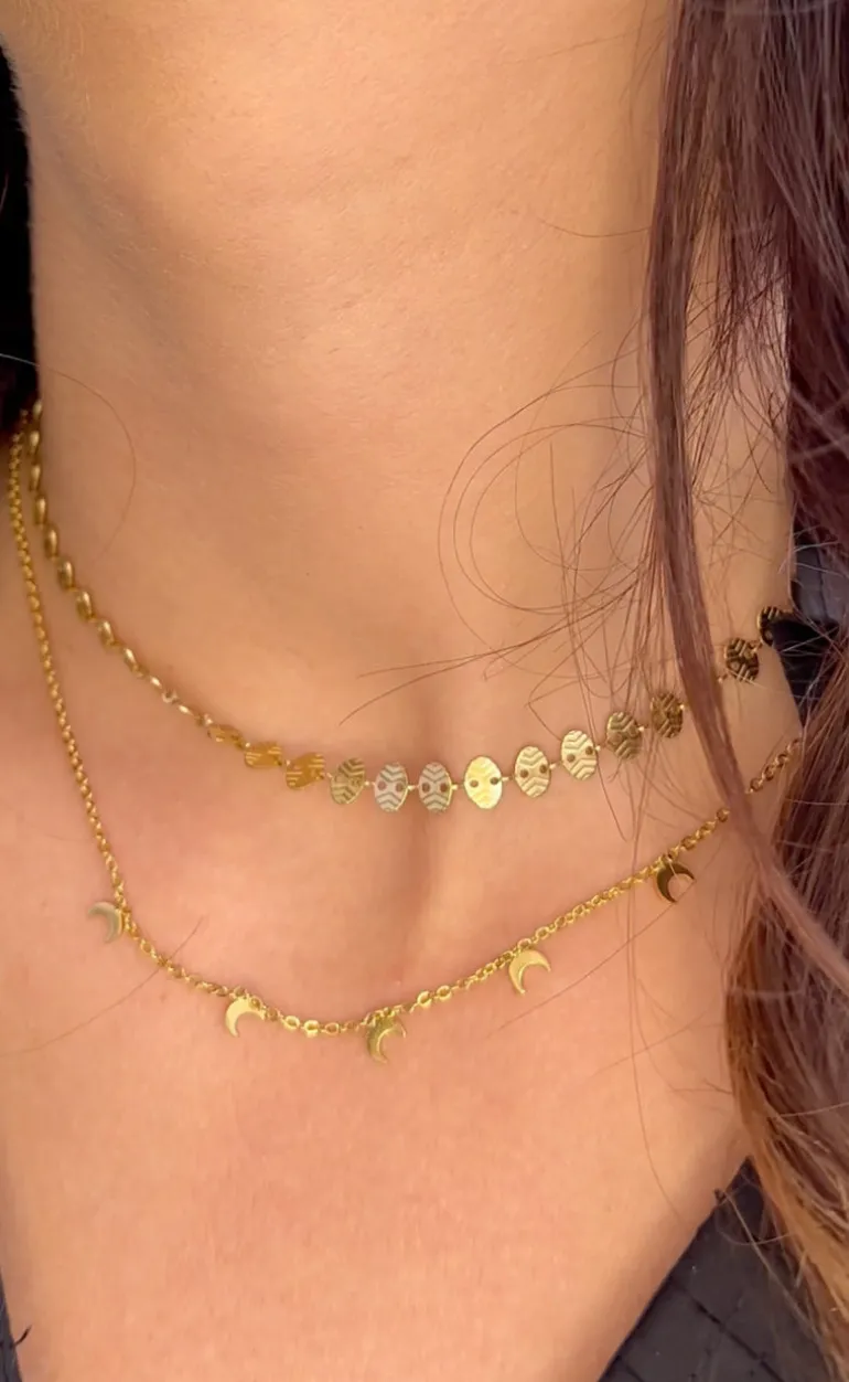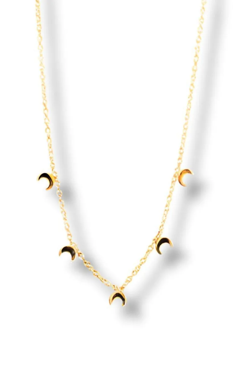 Bedst solgte halskæde fra Smykkeli Copenhagen i guld med 5 vedhæng formet som måner. Halskæden har et enkelt og stilrent look, der pifter ethvert outfit op.