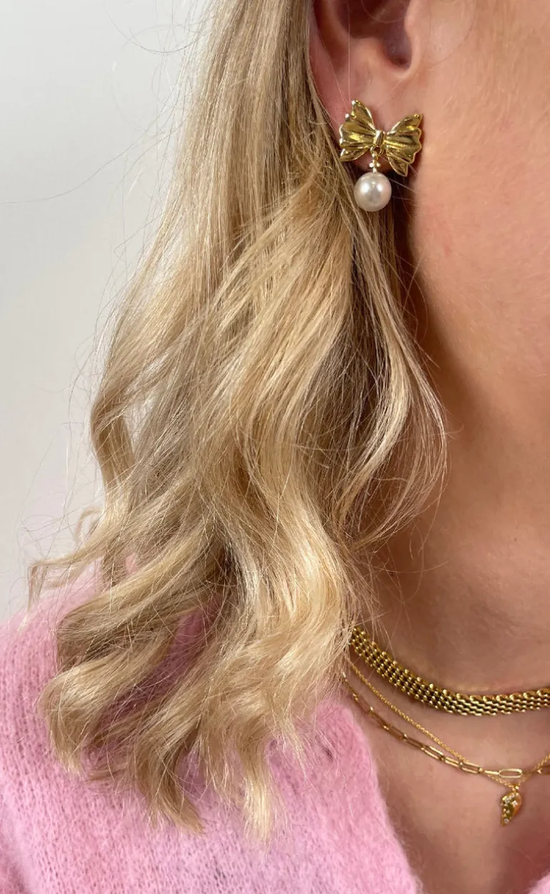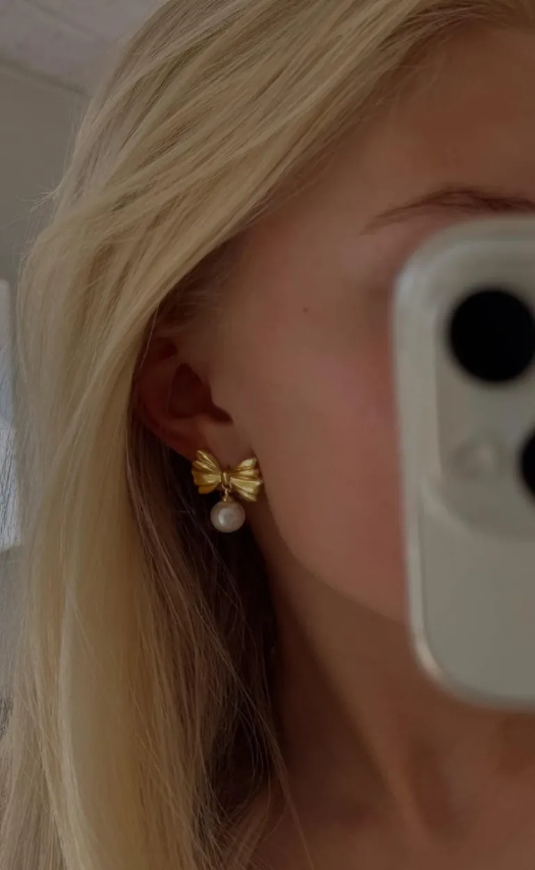 Små fine sløjfe øreringe fra Smykkeli Copenhagen i en guld farve.