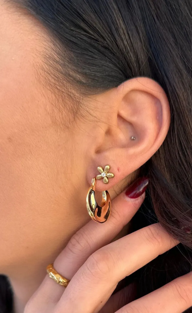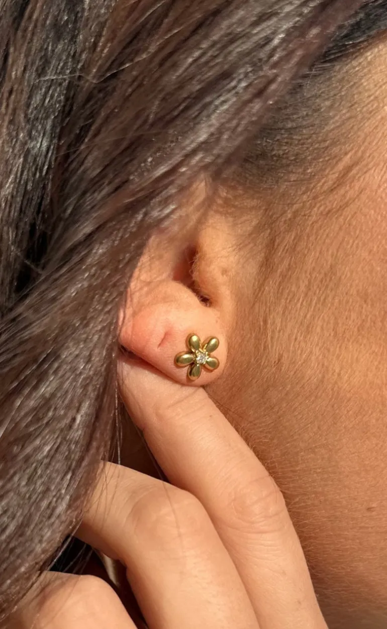 Fine studs fra Smykkeli Copenhagen i guld formet som en blomst med en lille zirconia sten i midten.