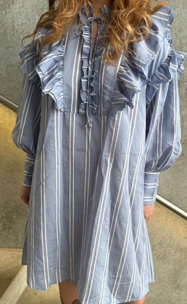Fin kjole med striber i blå og hvid.