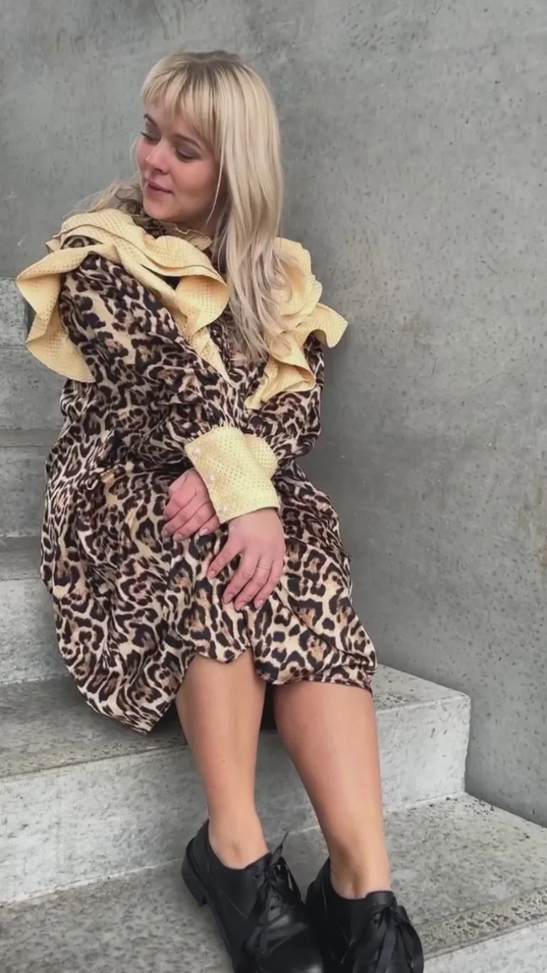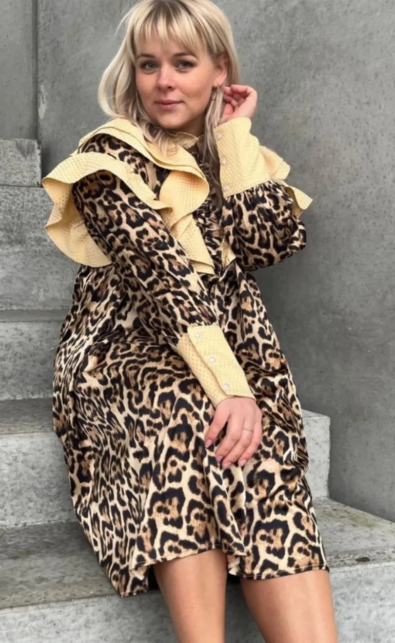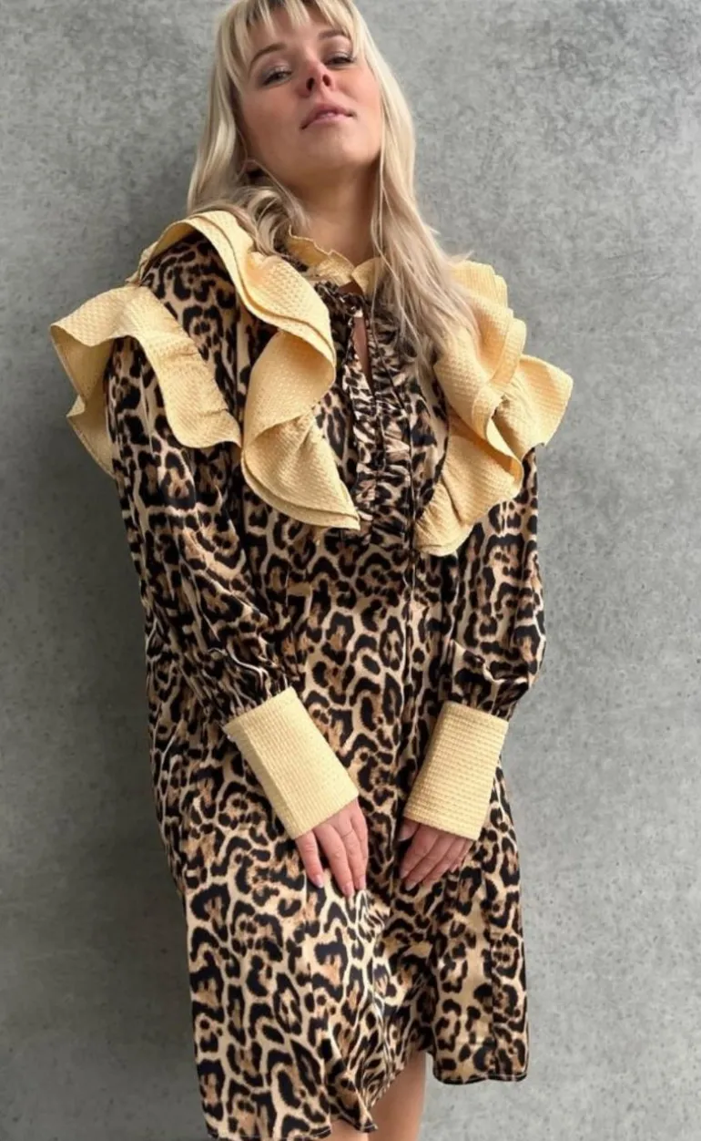 Denne smukke kjole går til knæet, og har gule frynser og manchetter.