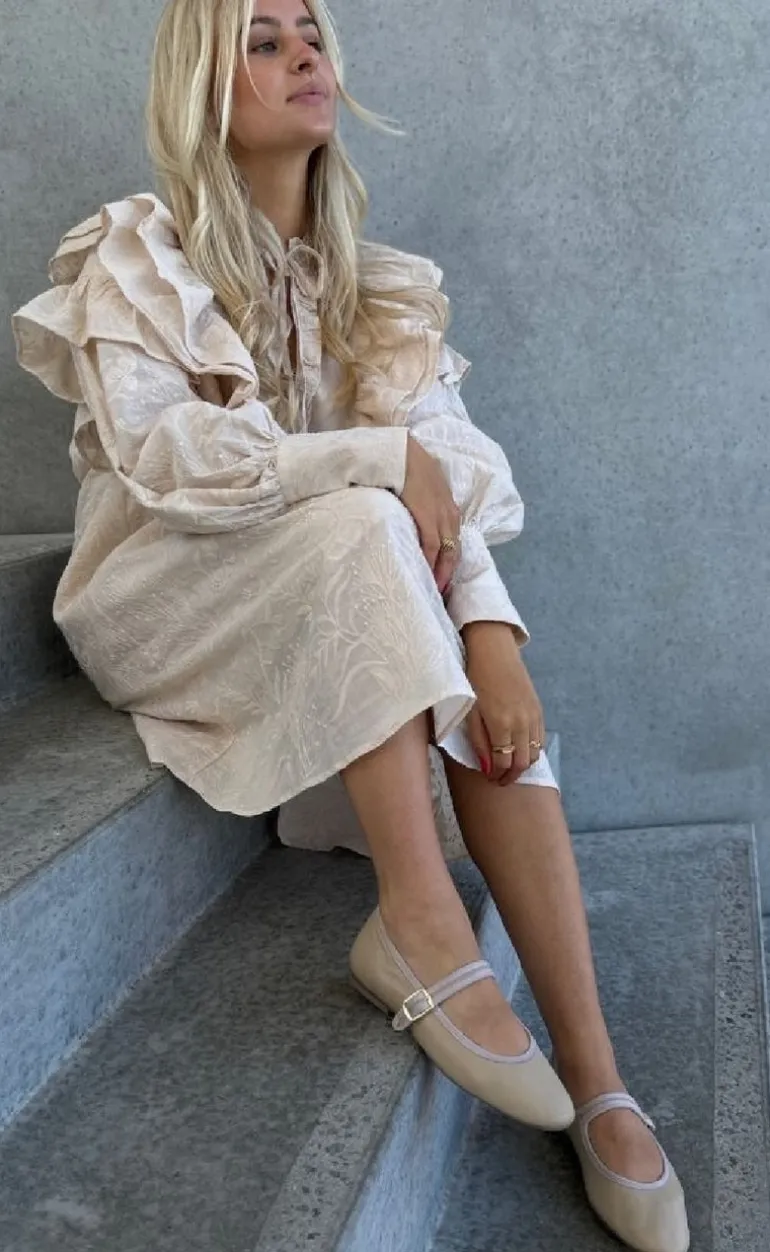 Den har flæser og diskrete broderi som tilføjer et drømmende udtryk, mens de perleformede hjerteknapper på manchetterne giver et ekstra feminint og unikt touch.