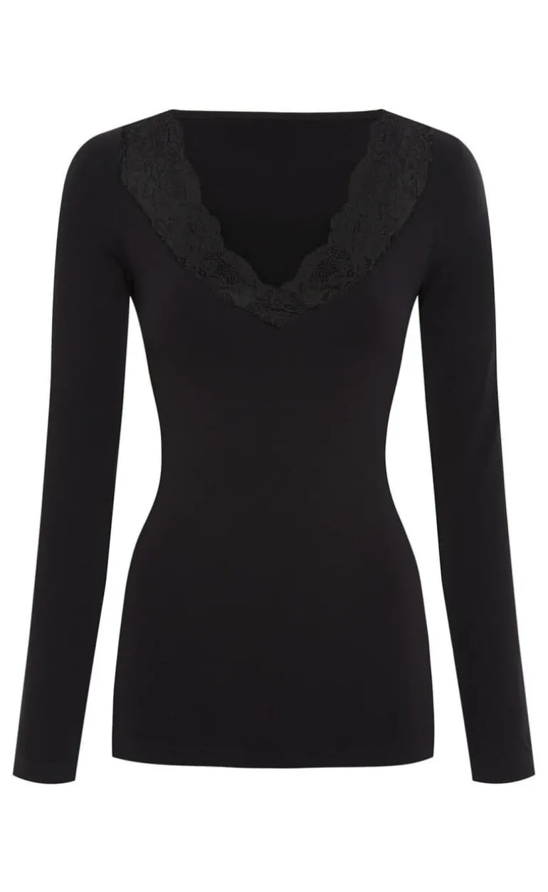 Basic langærmet bluse fra Tim & Simonsen, som har blonder ved halsudskæringen.