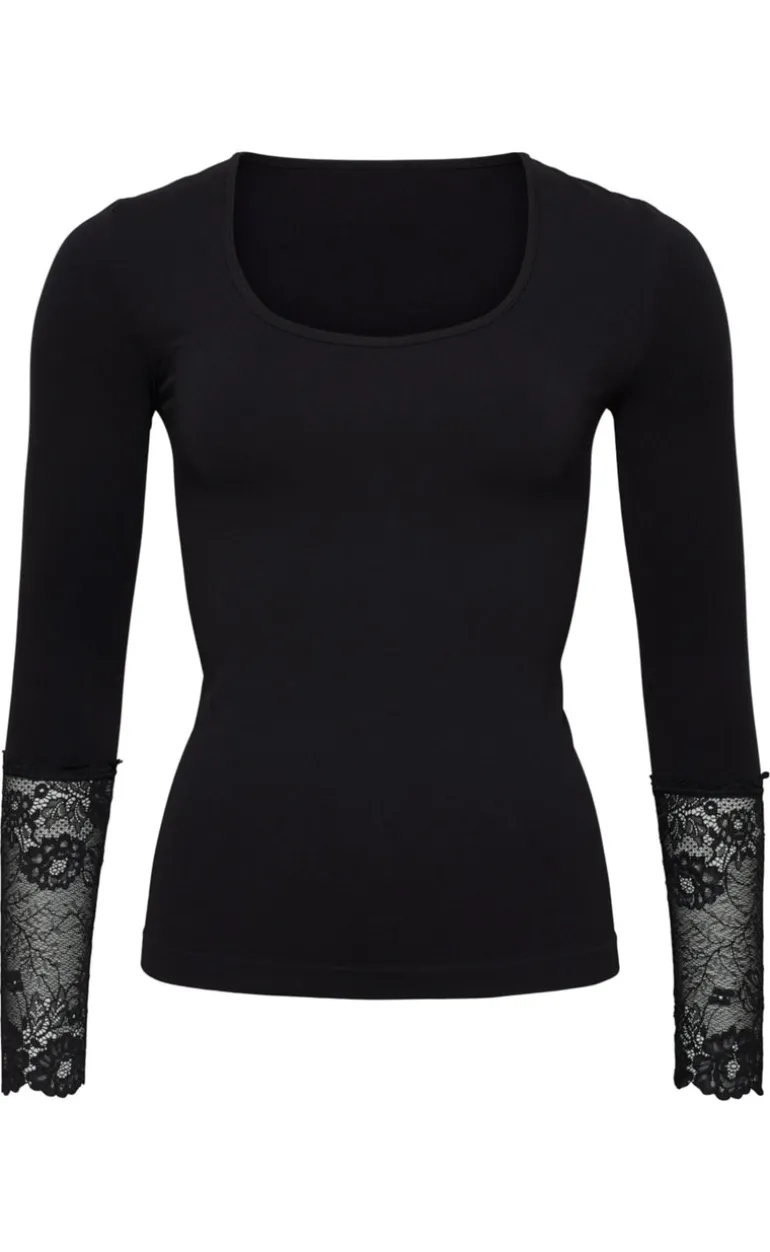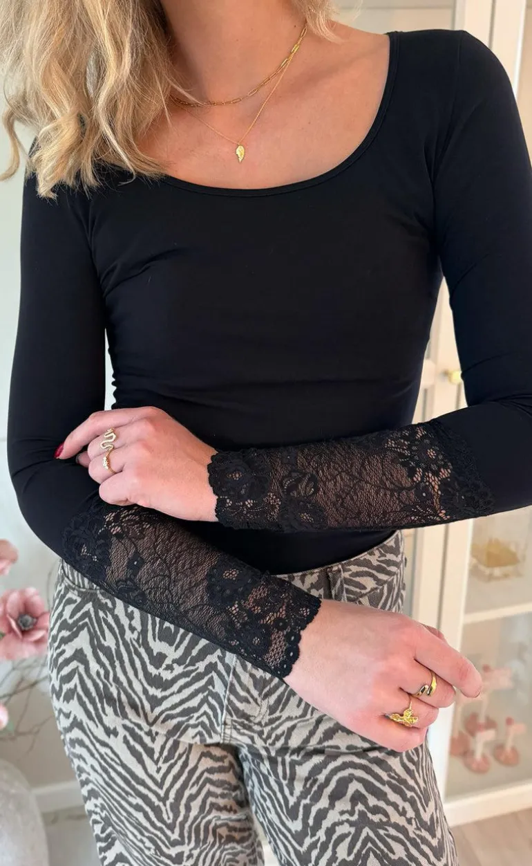 Blusen har lange ærmer med blonder, som giver et elegant look.