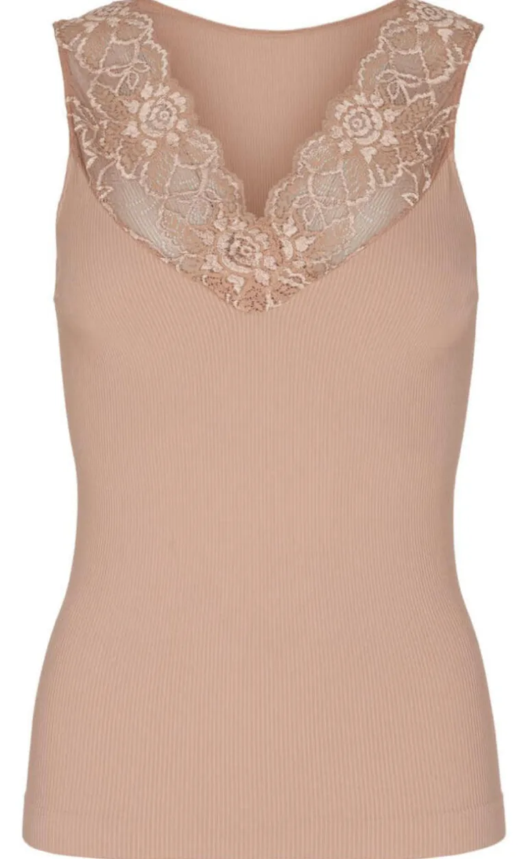 Toppen har en smuk blonde V-udskæring. Toppen er vendbar, så man selv vælger om man ønsker blonde-kanten foran eller bagtil.