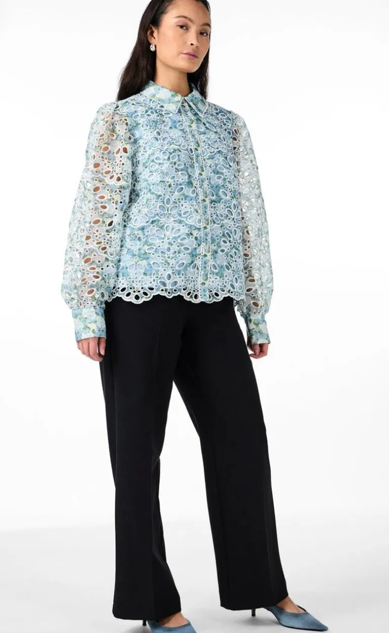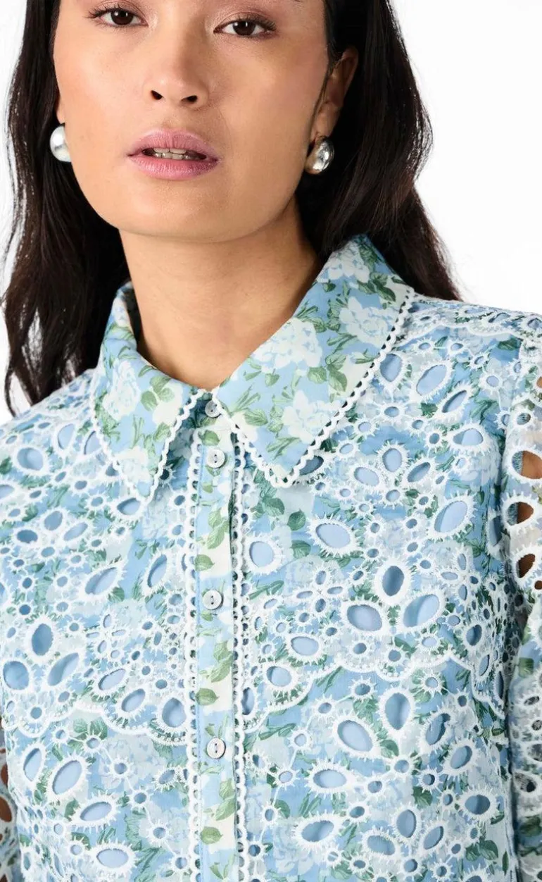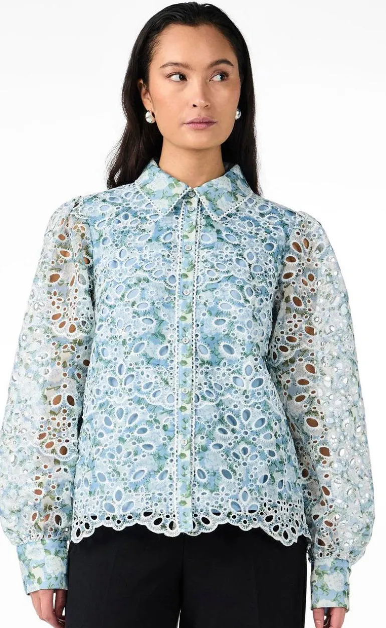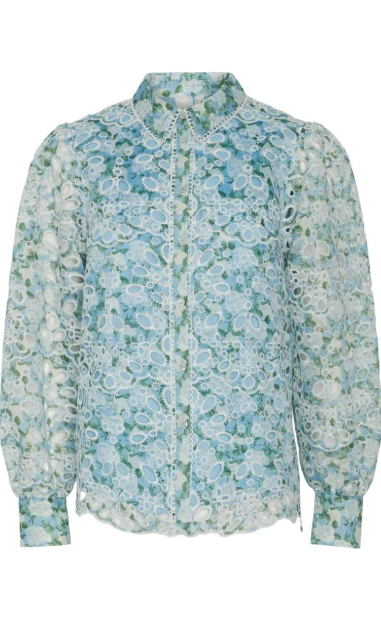 Skjorten har smukke broderi detaljer, lange transparente ærmer samt er gennemknappet.